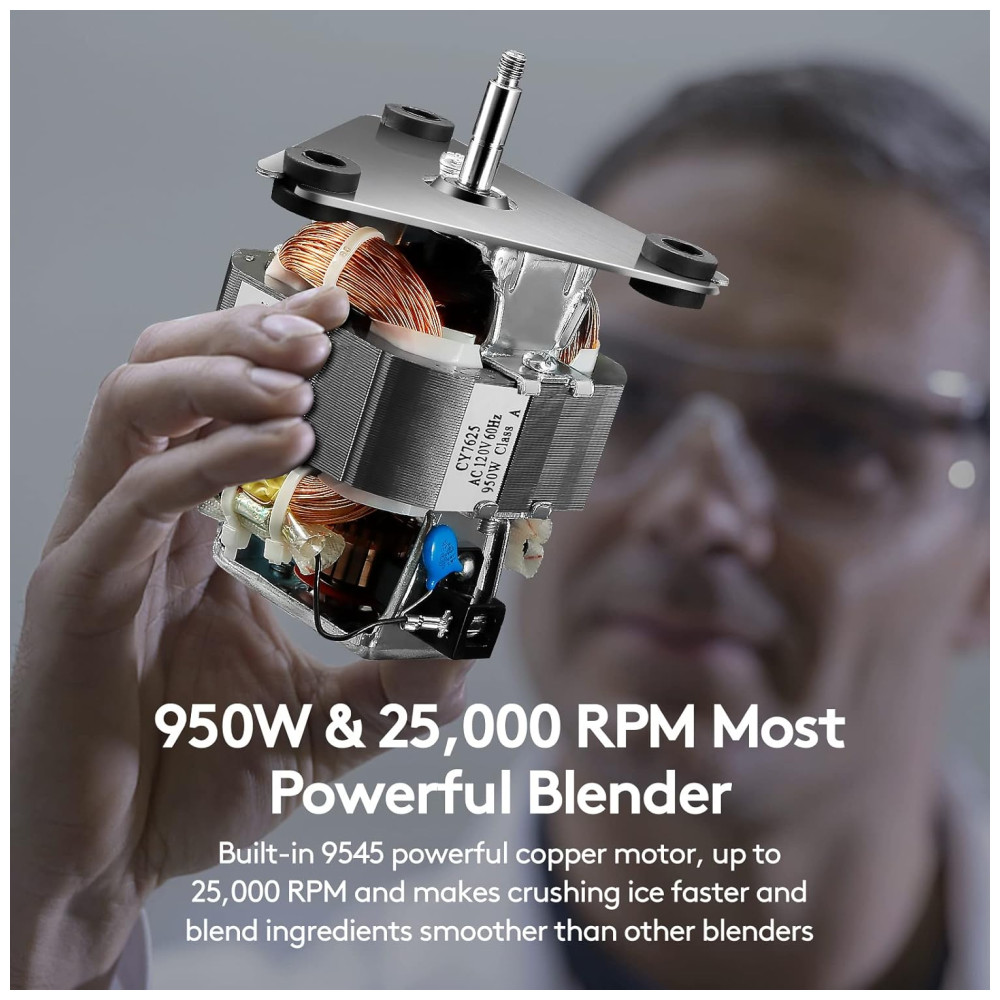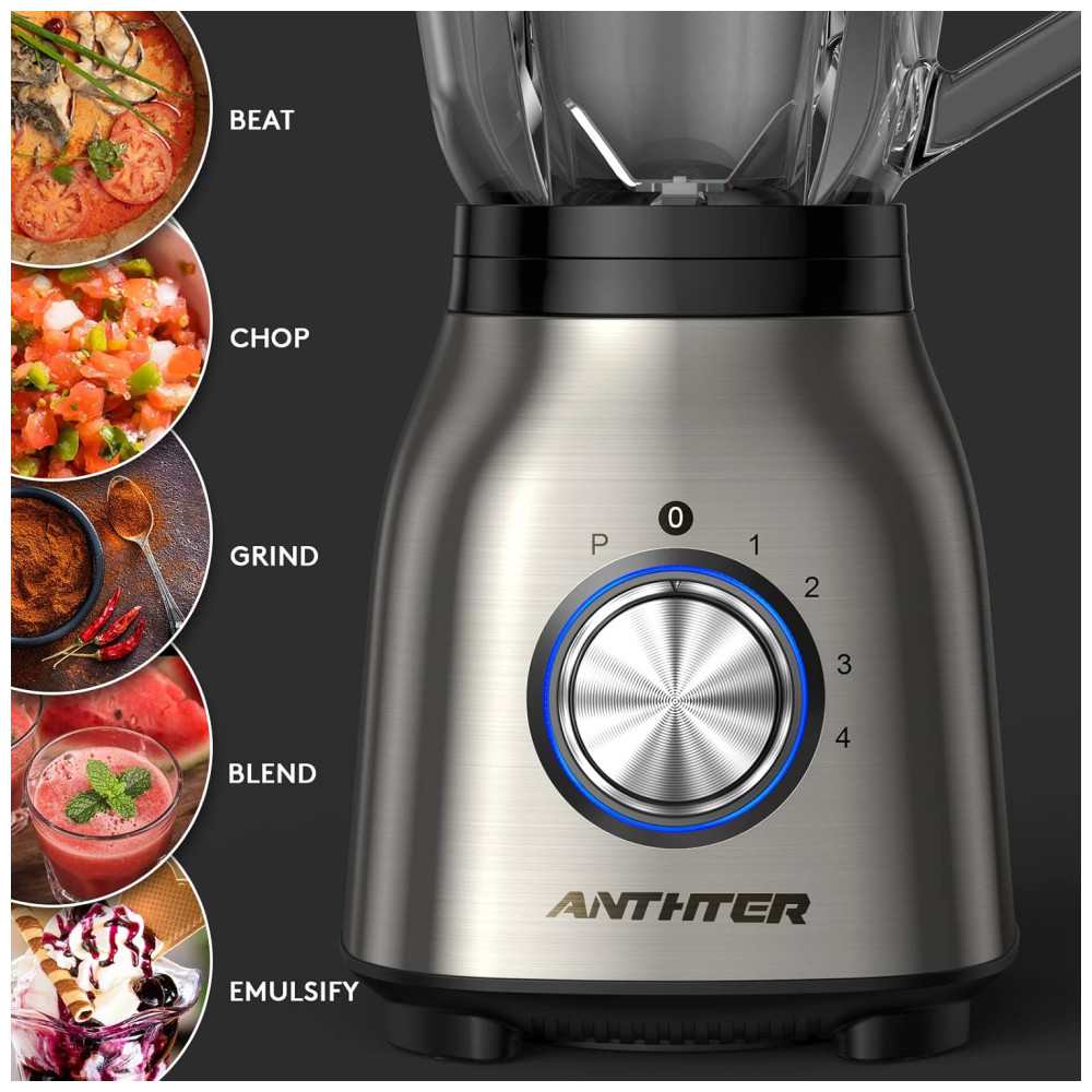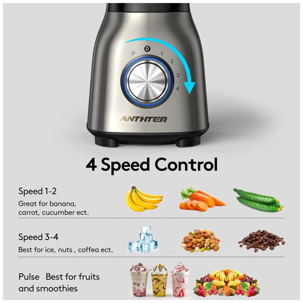 Mais Potente: O liquidificador Anthter para smoothies trabalha mais rápido e suave com seus 950W de potência. Desde misturas suaves até a trituração potente de gelo, as quatro funções de velocidade (baixa, alta, pulso baixo, pulso alto) podem lidar facilmente com qualquer tarefa, desde smoothies cremosos até bebidas geladas e muito mais.