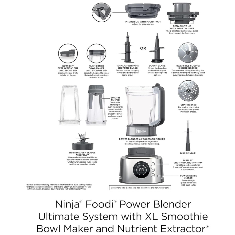 Componentes Incluídos: Montagem de Lâmina Total Trituração & Picar, Copinho de Extração de Nutrientes de 710 ml, Disco Reversível de Fatiar/Ralar, Disco de Ralar, Guia de Inspiração com 20 Receitas, Bowl de Smoothie XL de 530 ml com Pilão Embutido e Tampa para Armazenamento, Lâmina de Massa, Jarra de 2.13 litros para Liquidificador & Processador de Alimentos, Montagem de Lâmina Híbrida Edge, Base do Motor de Potência Máxima de 1600 Watts, Tampa do Bocal de Alimentação com Empurrador de 2 partes