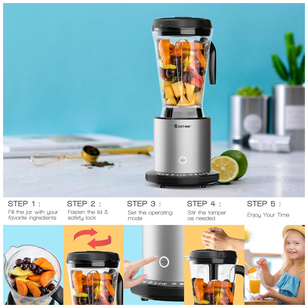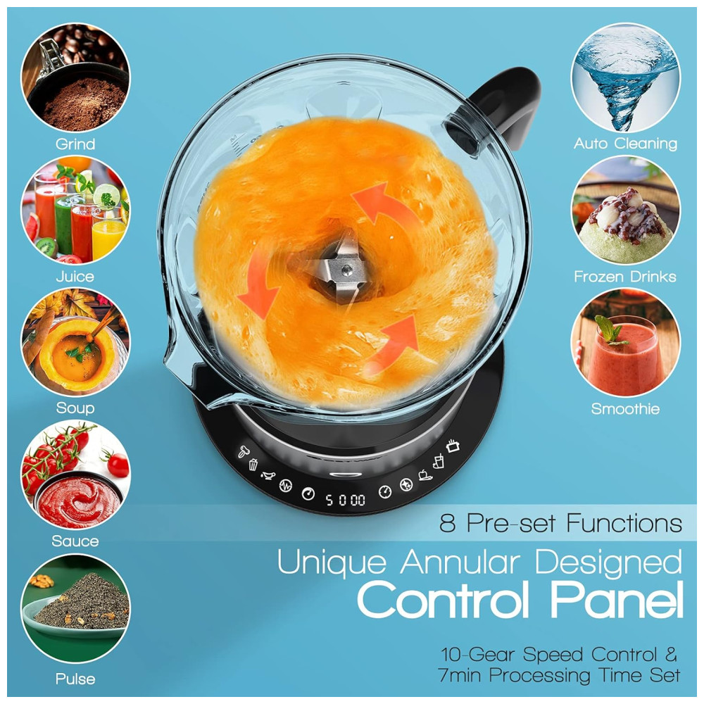 Painel de Controle Conveniente: Este liquidificador funcional é adotado com um painel com design anelar único que tem 2 maneiras de operar. Uma é selecionar um ícone seguindo o programa pré-definido e iniciar a máquina. A outra é escolher o tempo e a velocidade personalizados conforme necessário.