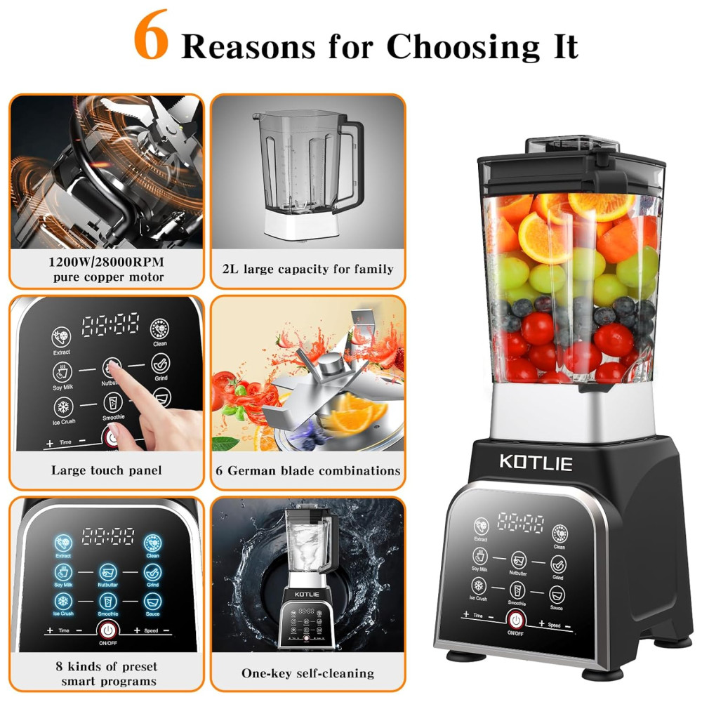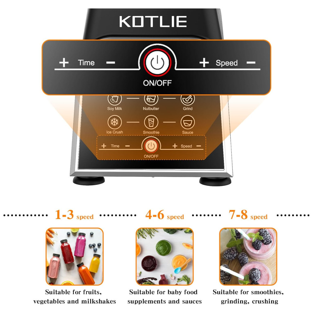 Liquidificador de Bancada 2L com 8 Funções Predefinidas e 6 Lâminas de Aço Inoxidável 110V 1200W KOTLIE Preto