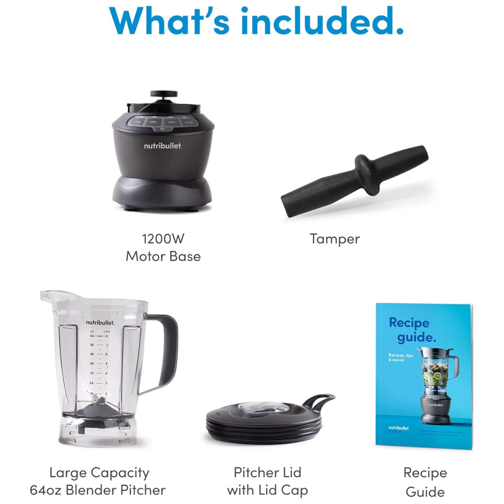 Inclui: 1 base de motor de 1200 watts, 1 jarra de liquidificador de 1,89 litros com tampa e tampa com ventilação, 1 socador e 1 livro de receitas.