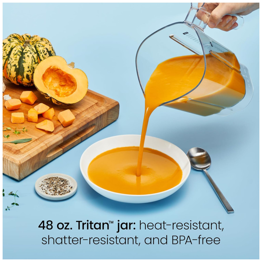 Este liquidificador de 1380W de alta potência é capaz de triturar gelo com facilidade e sem fazer muito barulho. Seu jarro de mistura Tritan resistente a quebras, com capacidade de 1,4 litros, é perfeito para preparar shakes e vitaminas para várias pessoas. Sua construção robusta permite até misturar líquidos quentes, desde que a tampa seja removida e o liquidificador seja coberto com uma toalha para evitar respingos.