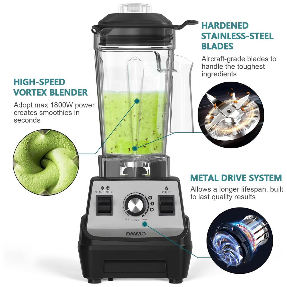 Este liquidificador OMMO é a escolha perfeita para quem busca potência de nível profissional, com um motor de 1800 W que permite criar uma grande variedade de bebidas deliciosas, desde shakes de proteína até coquetéis congelados. Equipado com lâminas de aço inoxidável endurecido de qualidade alimentar e um design de seis lâminas, ele consegue triturar gelo com facilidade, tornando-o ideal para smoothies gelados e outras bebidas congeladas.