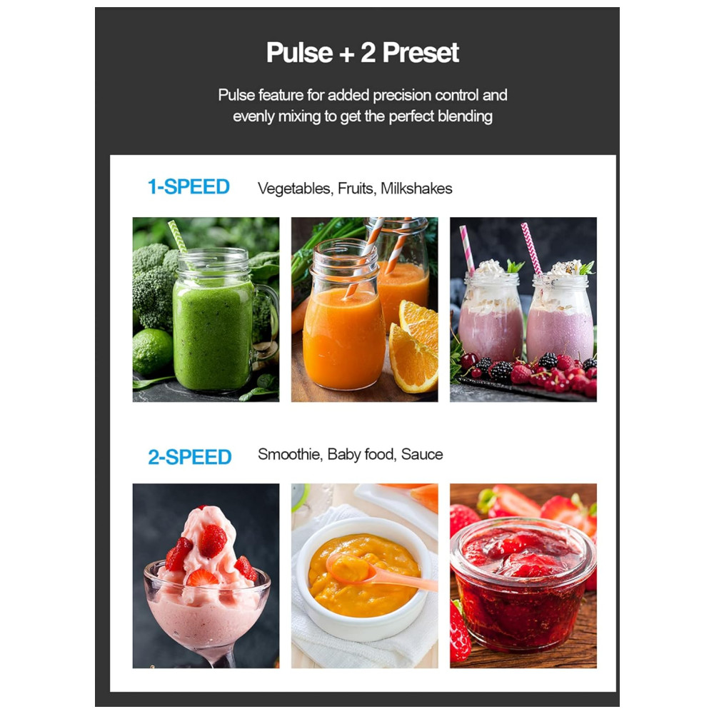 Fácil de limpar o conjunto de lâmina removível e a função de autolimpeza facilitam a limpeza após a mistura. Basta adicionar um pouco de detergente e água, definir o modo de pulso e executar por 5 a 10 segundos.