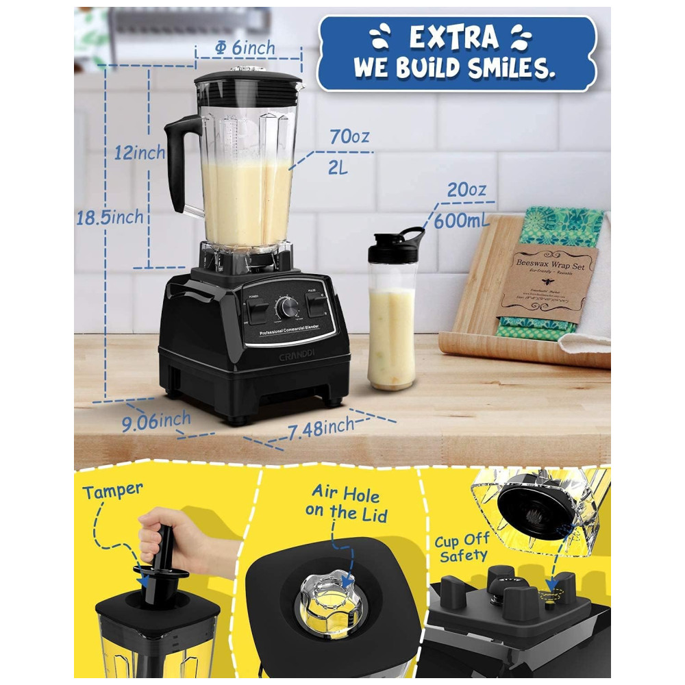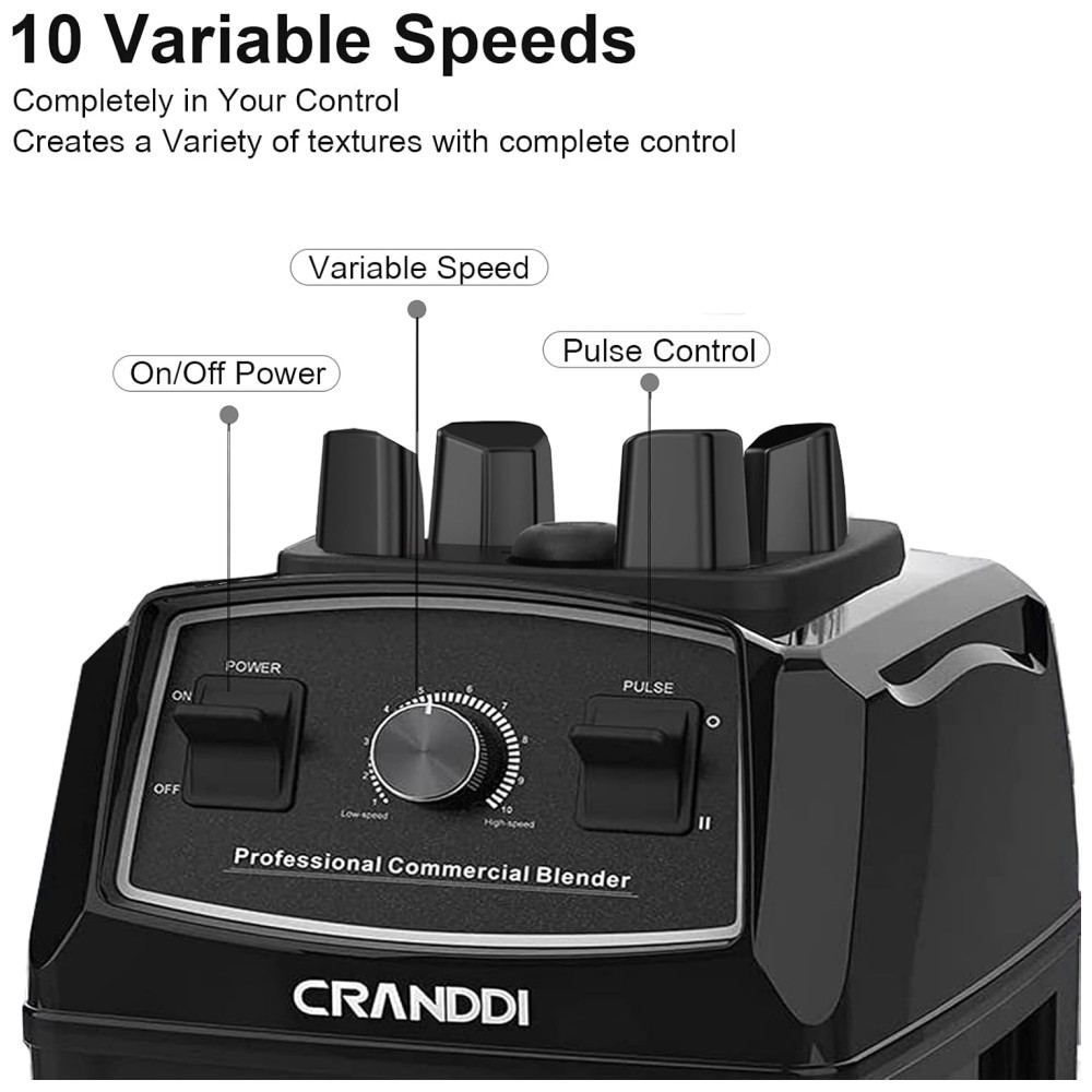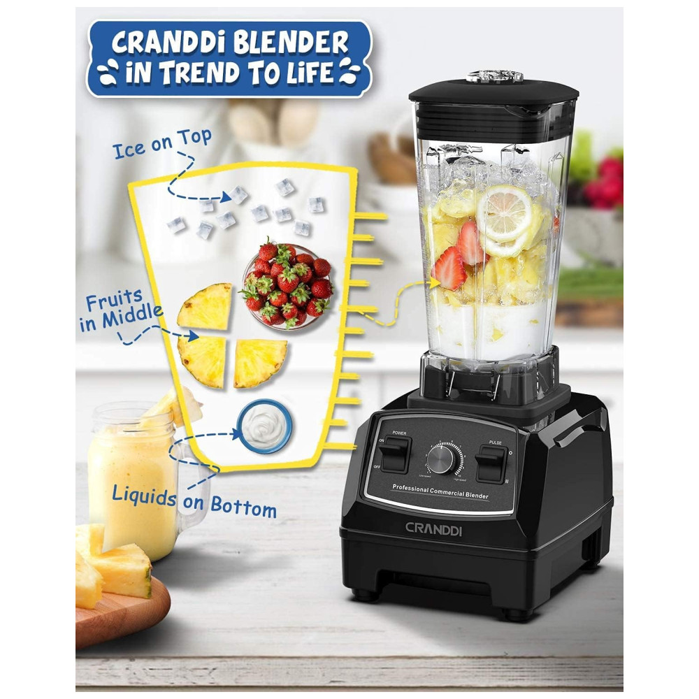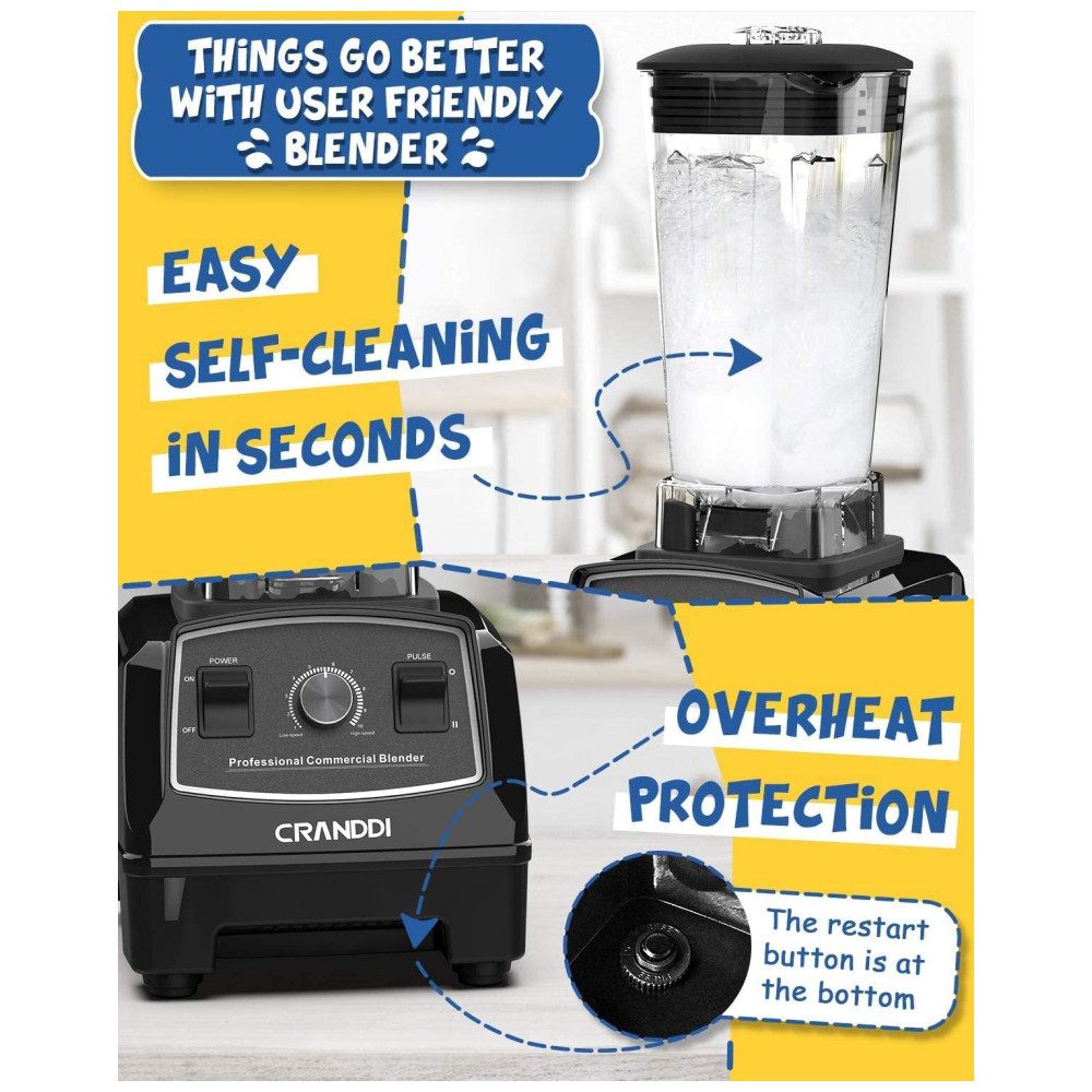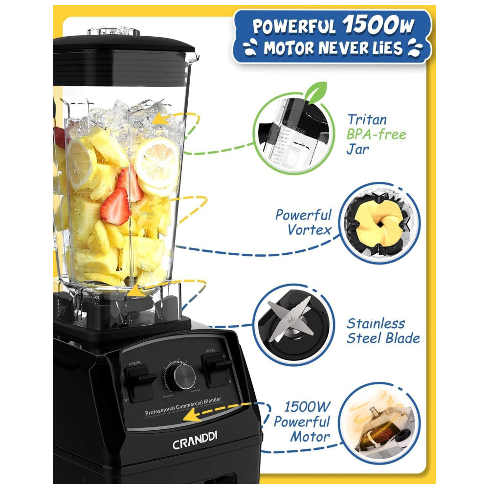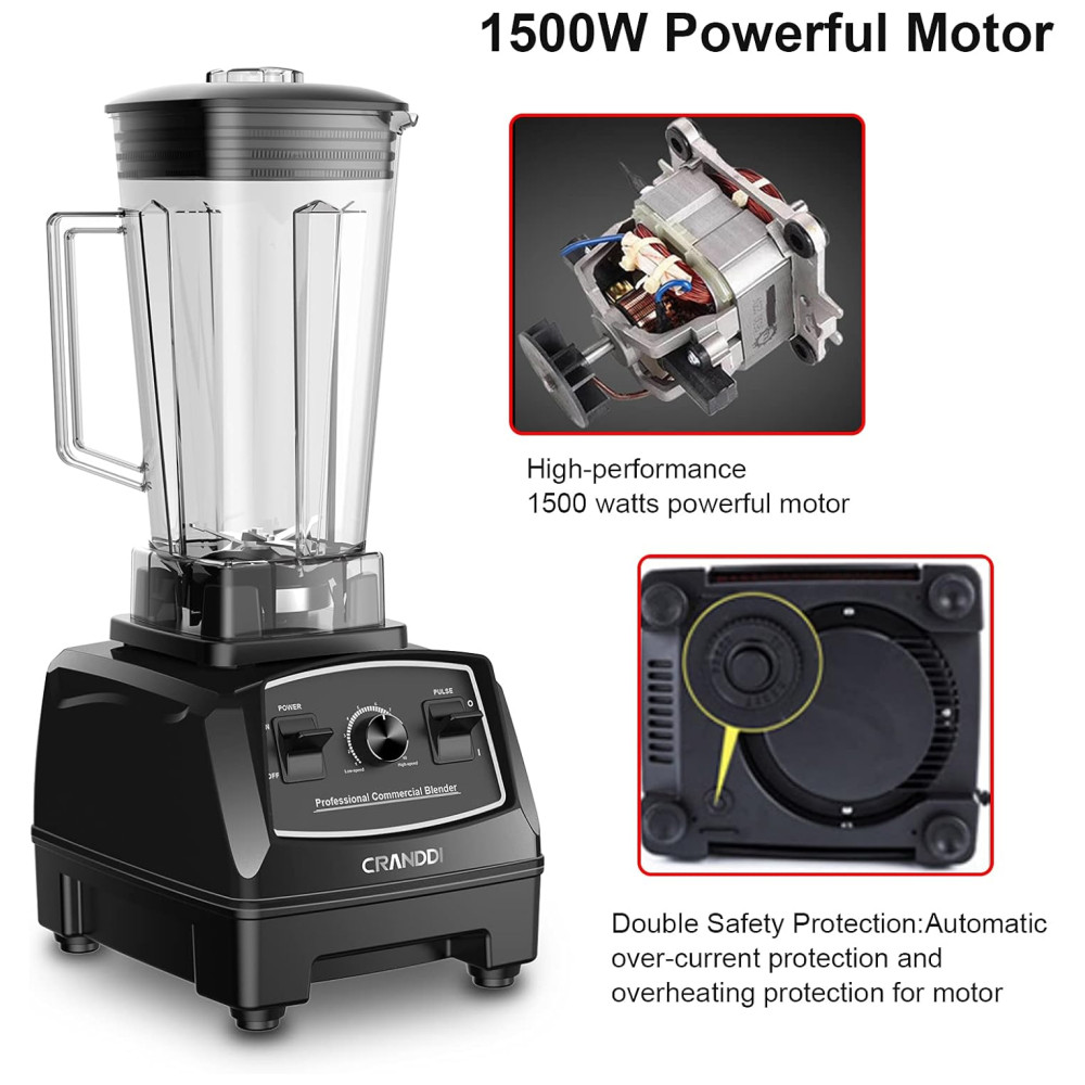 O Liquidificador Profissional CRANDDI possui 1500 watts de motor, incluindo tecnologia inteligente de desligamento automático, 24.000 RPM pode triturar gelo de forma rápida e fácil, misturando seus shakes e smoothies favoritos, suco, sorvete, frutas congeladas, sopas, molhos, moer nozes e café, comida para bebê, purê.