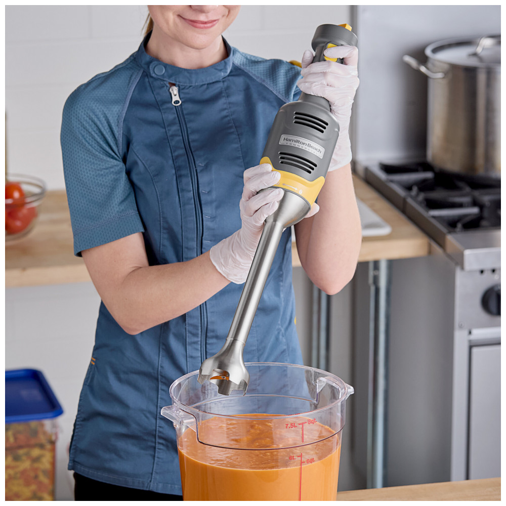 Triture, misture e bata com facilidade diretamente na tigela com este liquidificador de imersão Hamilton Beach de velocidade variável. Possui invólucro de plástico ABS e cabo ergonômico confortável com botão de pulso para máximo controle de mistura. Apresenta um eixo de aço inoxidável removível de 22,86 cm que trava com segurança e se desencaixa facilmente para limpeza. Com capacidade máxima de mistura de até 11 litros, é ideal para preparar porções menores de alimentos, proporcionando total segurança ao usuário. Este liquidificador de imersão possui um seletor de velocidade variável de 5.000-15.000 RPM para maior controle na textura de molhos, purês, sopas e emulsões. Possui cabo de energia amarelo que garante segurança na cozinha. Com motor potente de 250W, requer conexão elétrica de 110V e é ideal para cozinhas comerciais, padarias, restaurantes e cafeterias.