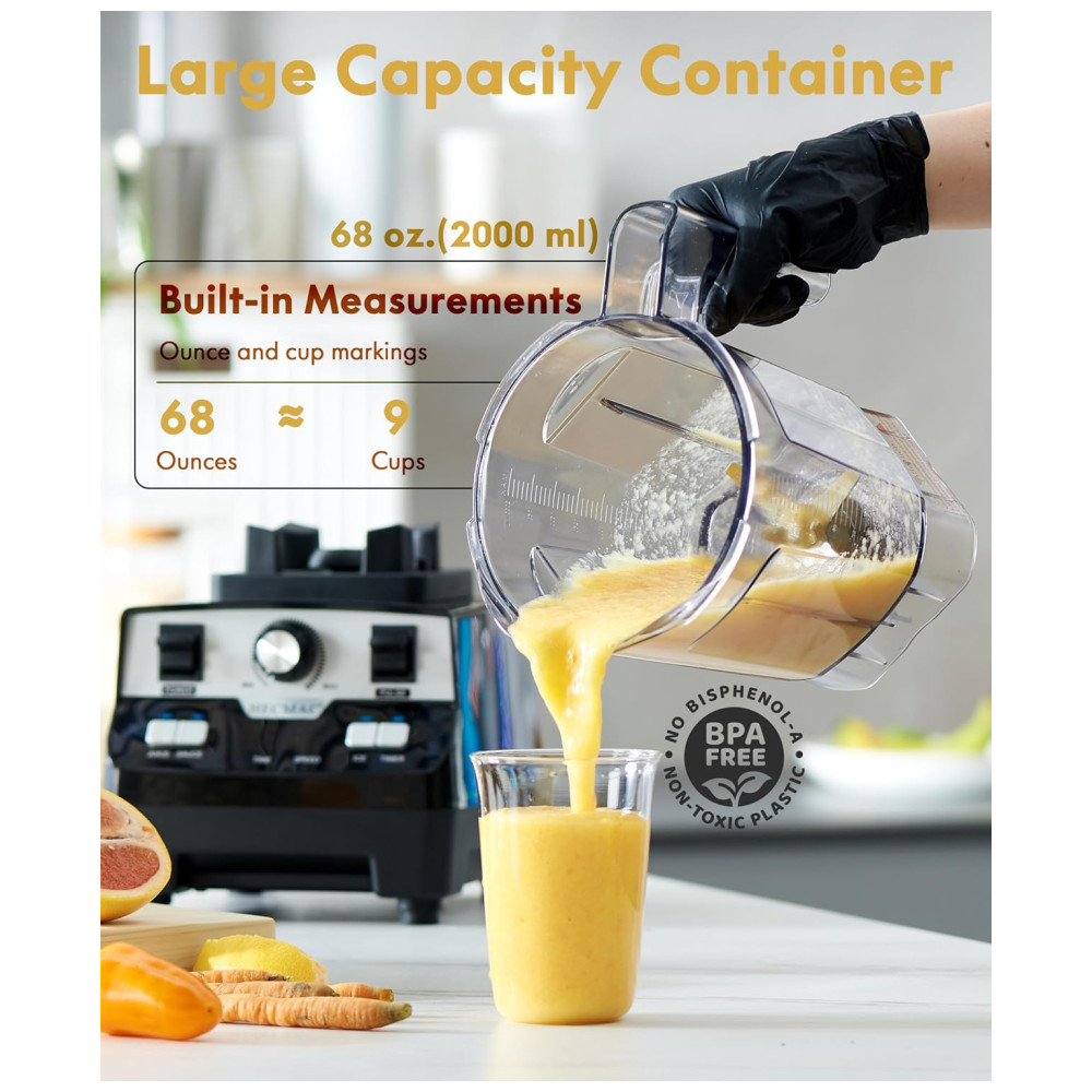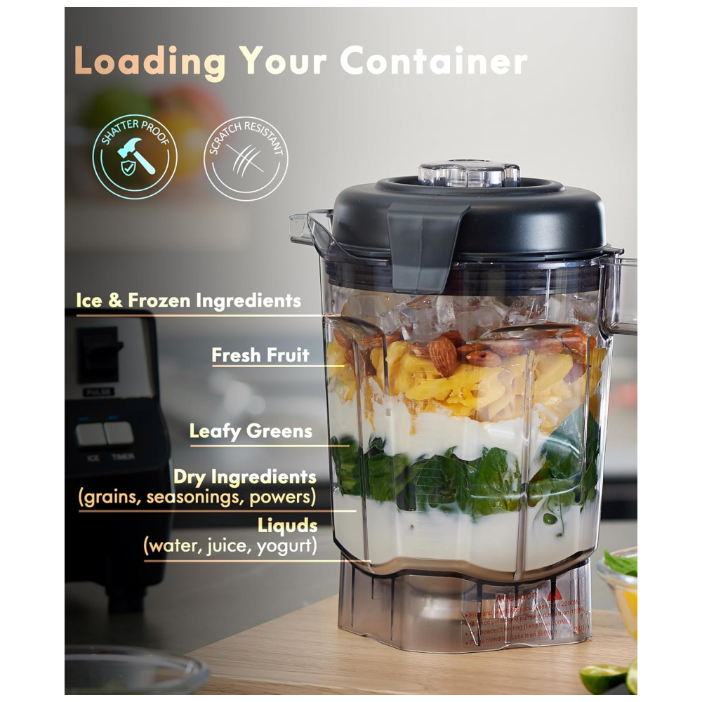Jarra Espaçosa e Transparente: O recipiente de 2L (68oz) é leve, fácil de armazenar e possui uma tampa de 2 peças para adicionar ingredientes enquanto mistura. Com lâminas de aço inoxidável cortadas a laser e medidas claras, além de um tamper incluído, ele garante uma mistura eficiente, até mesmo de misturas espessas.