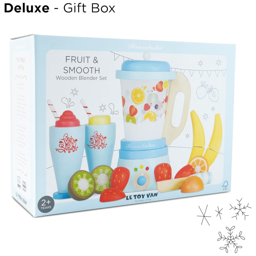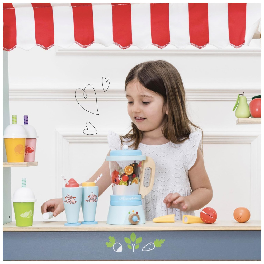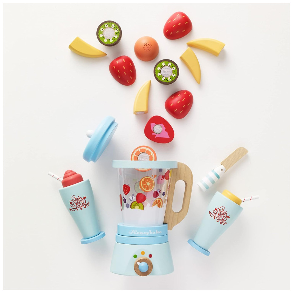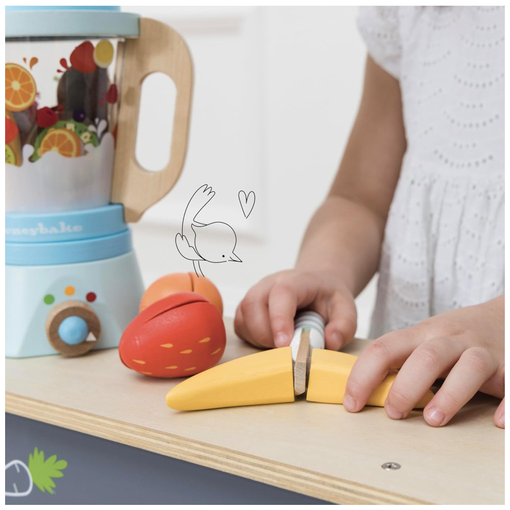 Le Toy Van Honeybake Blender Wooden Fruit Wooden Play Food Kids Kitchen Accessories Pretend Food Role Play Toy Kitchen Accessories é um conjunto de brinquedos de madeira projetado para crianças de 2 anos de idade. Composto por um liquidificador de madeira com jarra removível, 6 frutas de madeira fatiáveis, faca de madeira de brinquedo e 2 copos de madeira com coberturas removíveis, este conjunto é perfeito para horas de interação social positiva e jogos de dramatização.