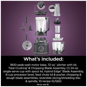 O que está incluído: Base do Motor de 1800 Watts, Jarra de 2,1 litros, Tigela do Processador de Alimentos de 1,9 litros com Tampa da Abertura de Alimentação, Conjunto de Lâminas Total Crushing e Chopping, Copo Individual de 710 ml com Tampa, Lâmina Hybrid Edge, Lâmina de Picar, Lâmina de Massa, Disco de Fatiar/Ralar.