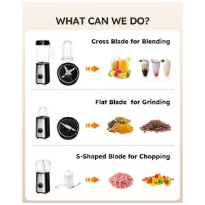 4 recipientes diferentes e 3 tipos de lâminas, cada combinação tem duas velocidades e opções de modo de pulso, faça comida rapidamente para você. Com este equipamento você pode fazer de tudo: smoothies, milkshakes, sucos de frutas, sucos de vegetais, pesto, molhos, carne picada, manteiga de amendoim, leite de amêndoa, soja, café em pó, especiarias em pó, etc. Dicas: Não bata o gelo sozinho, certifique se de adicionar a quantidade certa de água ou leite, proporção recomendada: 1:1. Não coloque nenhum líquido no conjunto picador de carne.
