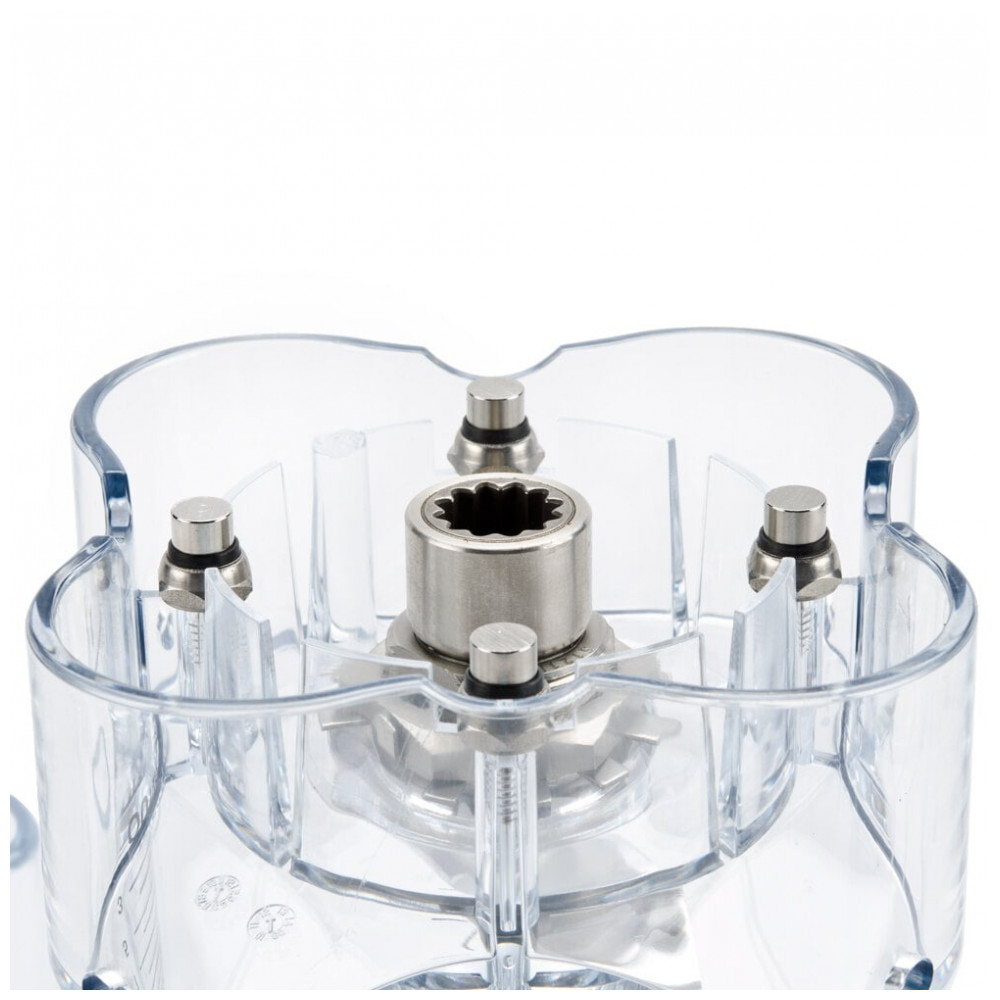 A jarra de policarbonato com capacidade de 1,89 L suporta grandes volumes e é empilhável para armazenamento eficiente. Inclui marcações graduadas para medição precisa, copo dosador no tampo com vedação de borracha bloqueável e lâminas internas de aço inoxidável para corte eficaz de ingredientes espessos, como salsas e dips com pouco líquido.