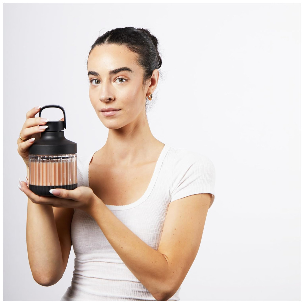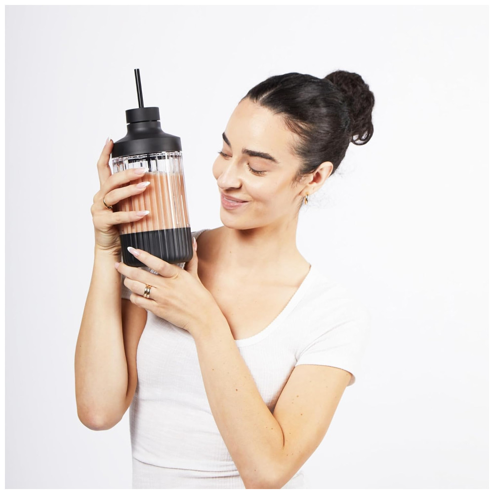 Componentes Inclusos: Base do Liquidificador, Suporte da Lâmina, Recipiente de Mistura de 1000 mL, Recipiente de Mistura de 500 mL, 2x Tampas de Armazenamento, Tampa para Beber, Tampa com Clip de Transporte, Garrafa de Hidratação em Aço Inoxidável, Canudo Revestido de Cor, Tampa com Canudo, Escova de Limpeza para Canudo, Escova para Lâmina