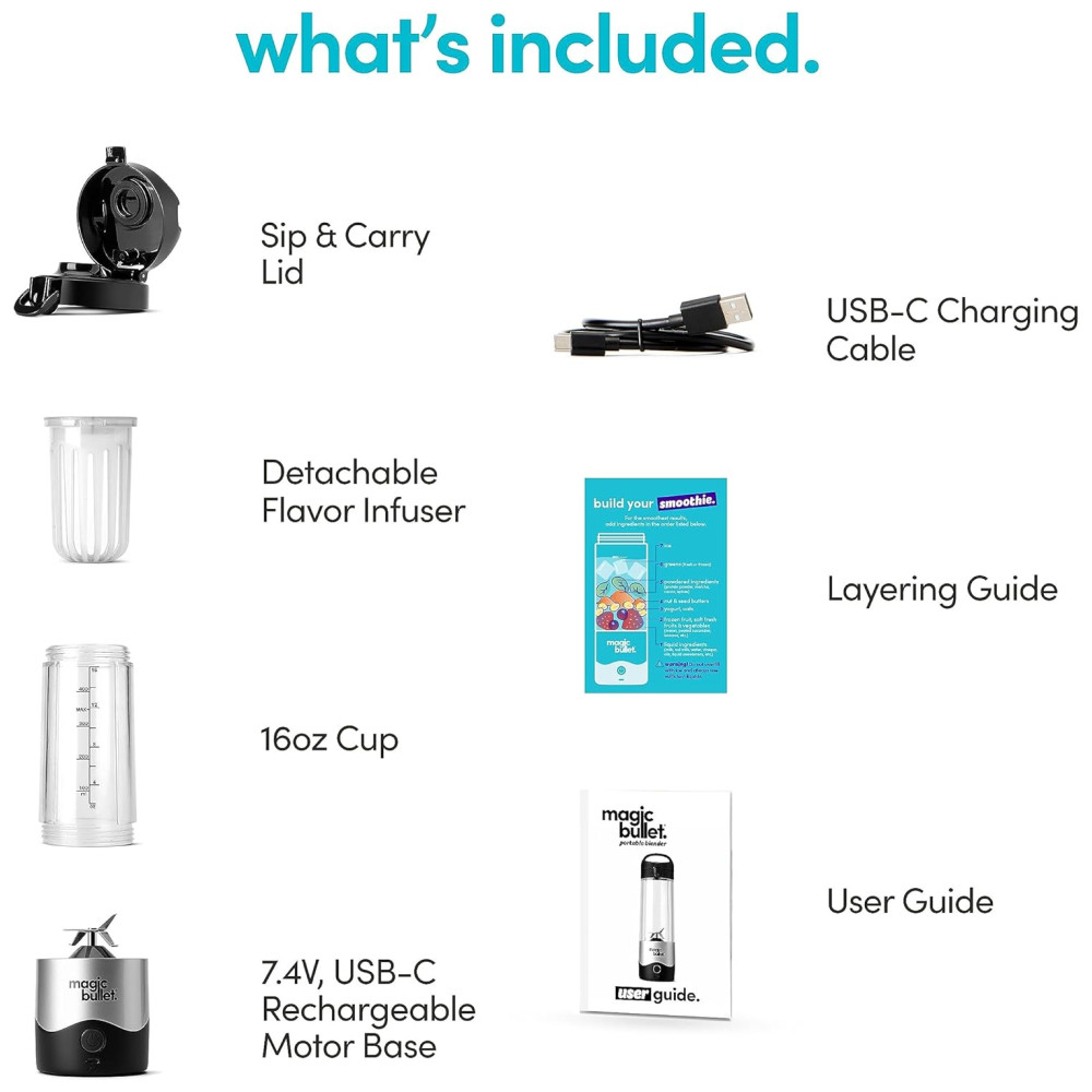 Componentes Inclusos: Base do Motor Recarregável, Copo de 473,2 ml, Infusor de Sabor Removível, Tampa para Beber e Transportar, Cabo de Carregamento USB-C, Guia de Camadas, Guia do Usuário
