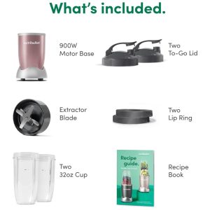 O conjunto inclui: (1) Base do motor de 900W, (1) Lâmina extratora, (2) Copos de 946 ml, (2) Tampas para viagem, (2) Anéis de vedação, (2) Anéis de vedação com alça e Livro de receitas.