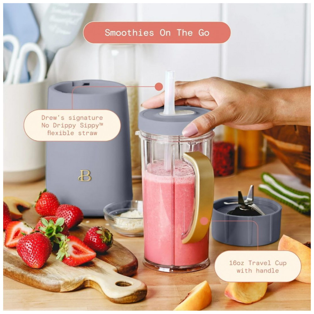 Liquidificador pessoal compacto de 240W da linha Beautiful by Drew Barrymore, com acabamento branco fosco e sistema de copos para preparo direto e consumo imediato de bebidas e receitas em pequenas porções. Utiliza conjunto de lâminas em aço inox para mistura e trituração, indicado para smoothies individuais, pequenos molhos, preparo de alimentos em porções reduzidas e moagem de café e temperos secos.