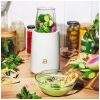 O kit inclui base com motor, copos de diferentes capacidades, tampa de viagem com alça e canudo com sistema anti‑pingos, além de tampas para armazenamento e anéis de acabamento para beber diretamente no copo. Os recipientes são produzidos em material livre de BPA, compatíveis com lava‑louças na prateleira superior, enquanto a base é acionada por giro, facilitando o uso em bancadas compactas.