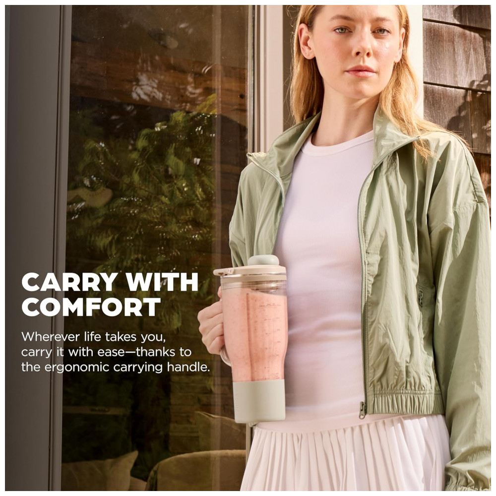 A base apresenta formato compacto com acabamento que se integra a diferentes ambientes de cozinha, ocupando pouco espaço na bancada. O copo possui pega ergonômica e formato compatível com a maioria dos porta-copos automotivos, favorecendo o transporte diário. As partes em contato com alimentos são livres de BPA, atendendo ao uso residencial de preparo de bebidas frias.