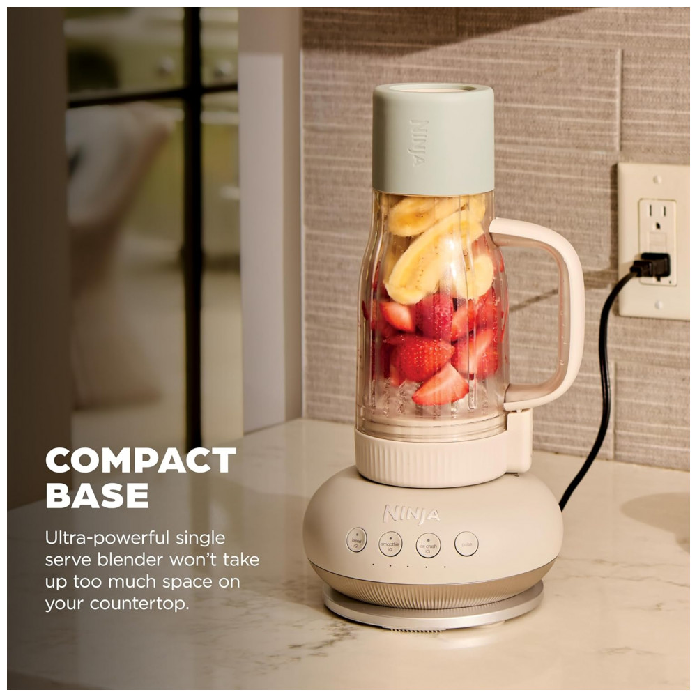 O liquidificador pessoal Ninja Blendboss foi projetado para preparo de smoothies e bebidas geladas em porções individuais, combinando base compacta de bancada com copo de viagem de 770 ml. O sistema utiliza motor de 1200 W de potência de pico e conjunto de lâminas em aço inoxidável para triturar gelo em textura de neve e misturar frutas, líquidos e outros ingredientes de forma homogênea.