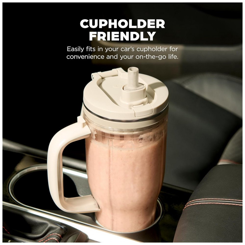 O copo de viagem acompanha tampa com vedação e bocal tipo chug, permitindo beber diretamente no recipiente após o preparo sem necessidade de transferência para outro copo. A tampa inclui ainda canudo destacável, oferecendo duas formas de consumo conforme a preferência do usuário e facilitando o uso em deslocamentos, academia, trabalho e atividades ao ar livre.