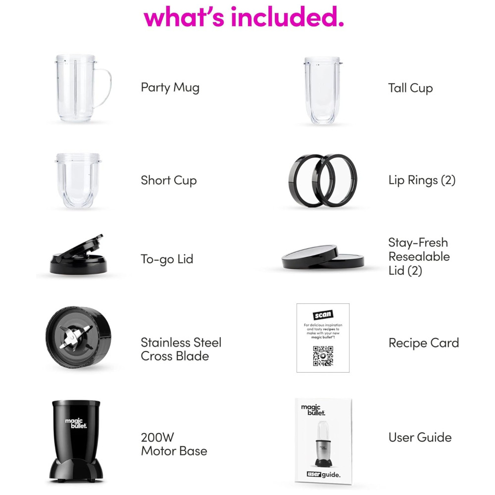 Componentes Incluídos: (1) Base do Motor de 250W, (1) Lâmina Cruzada, (1) Copo Alto, (1) Copo Curto, (1) Caneca para Festas, (2) Anéis para os Lábios, (2) Tampas Reutilizáveis Stay-Fresh, (1) Tampa para Viagem e Guia de Receitas