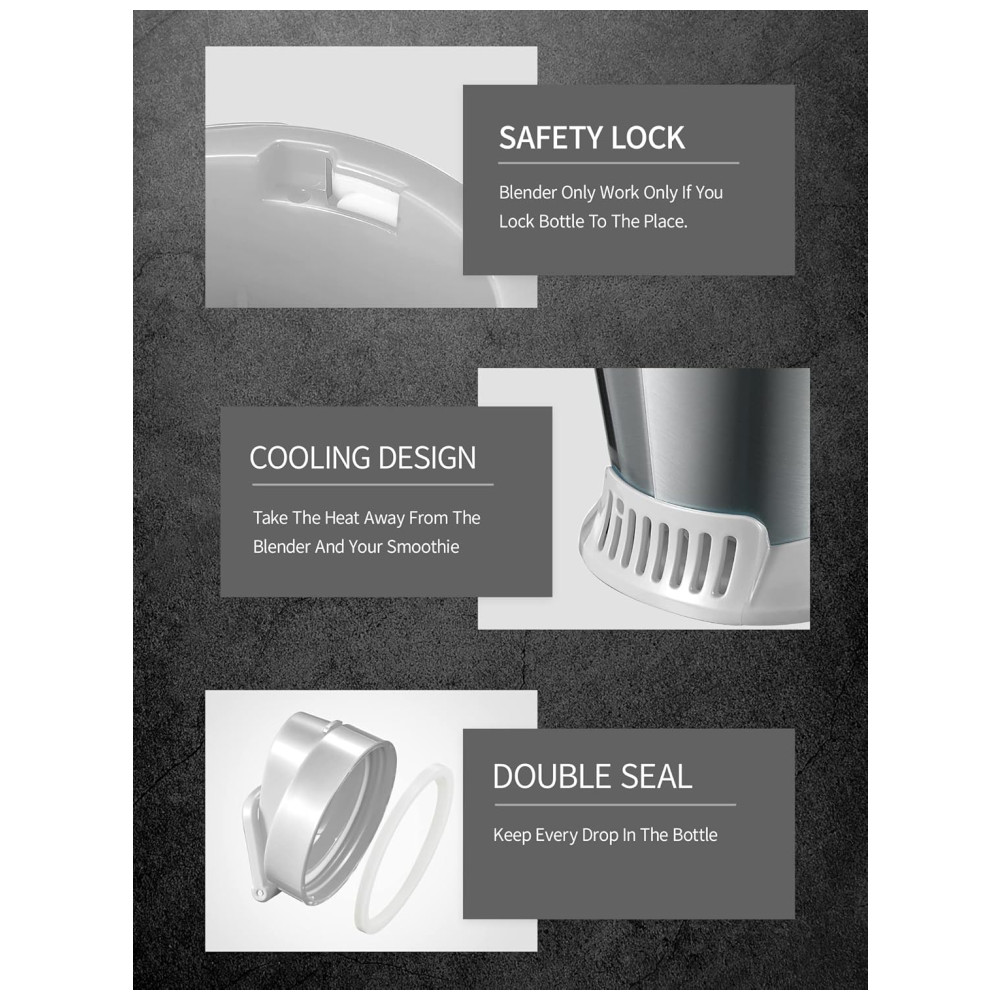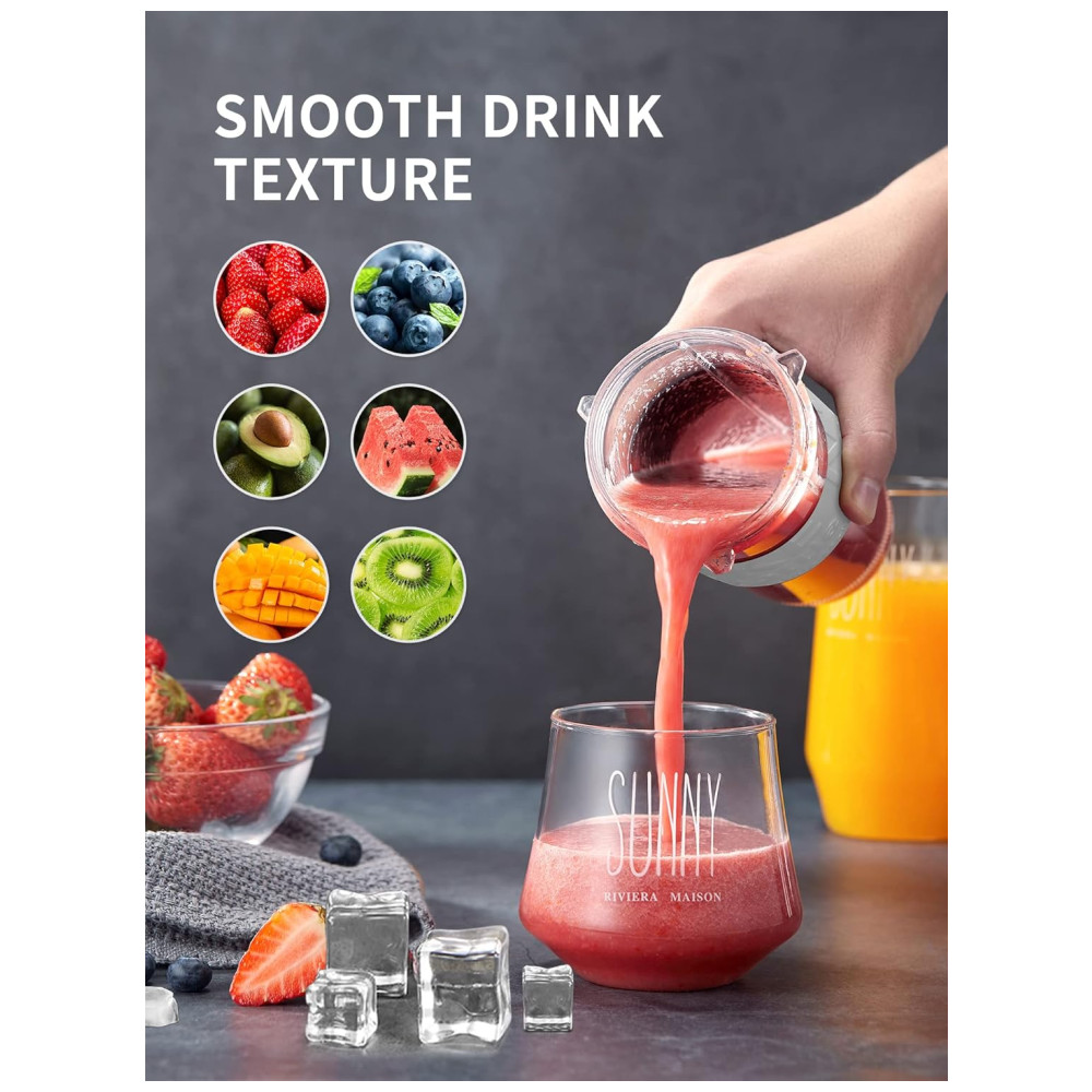 PEQUENO, MAS PODEROSO Liquidificador de smoothie de tamanho compacto, projetado para pequenos espaços de bancada. Com motor potente de 500 W, é forte o suficiente para fazer suas bebidas preferidas, perfeitas para shakes de proteína e smoothies diários.
