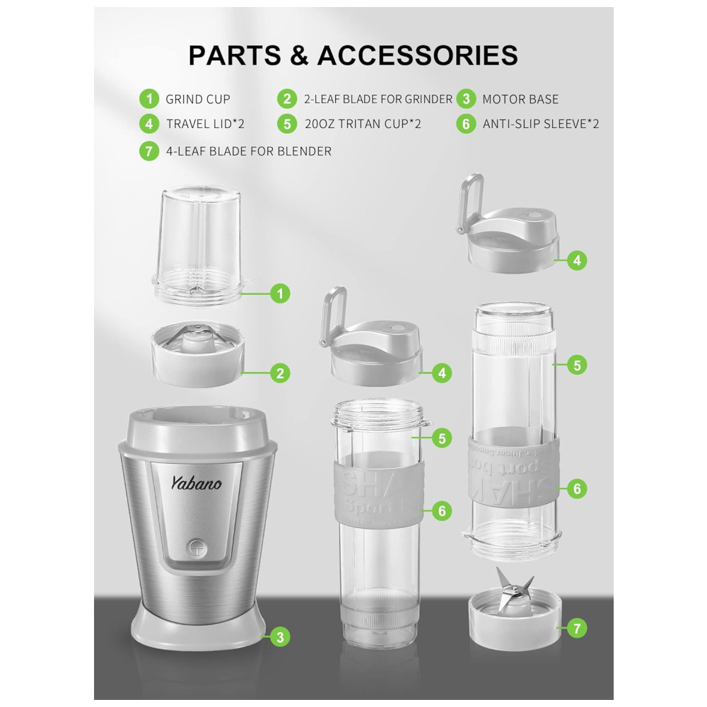 ON THE GO Liquidificador pessoal Yabano com 2 garrafas de viagem de 20 onças e 2 tampas de viagem, você pode fazer sua bebida favorita e depois levar e ir embora. E ambas as garrafas cabem no porta copos do carro.