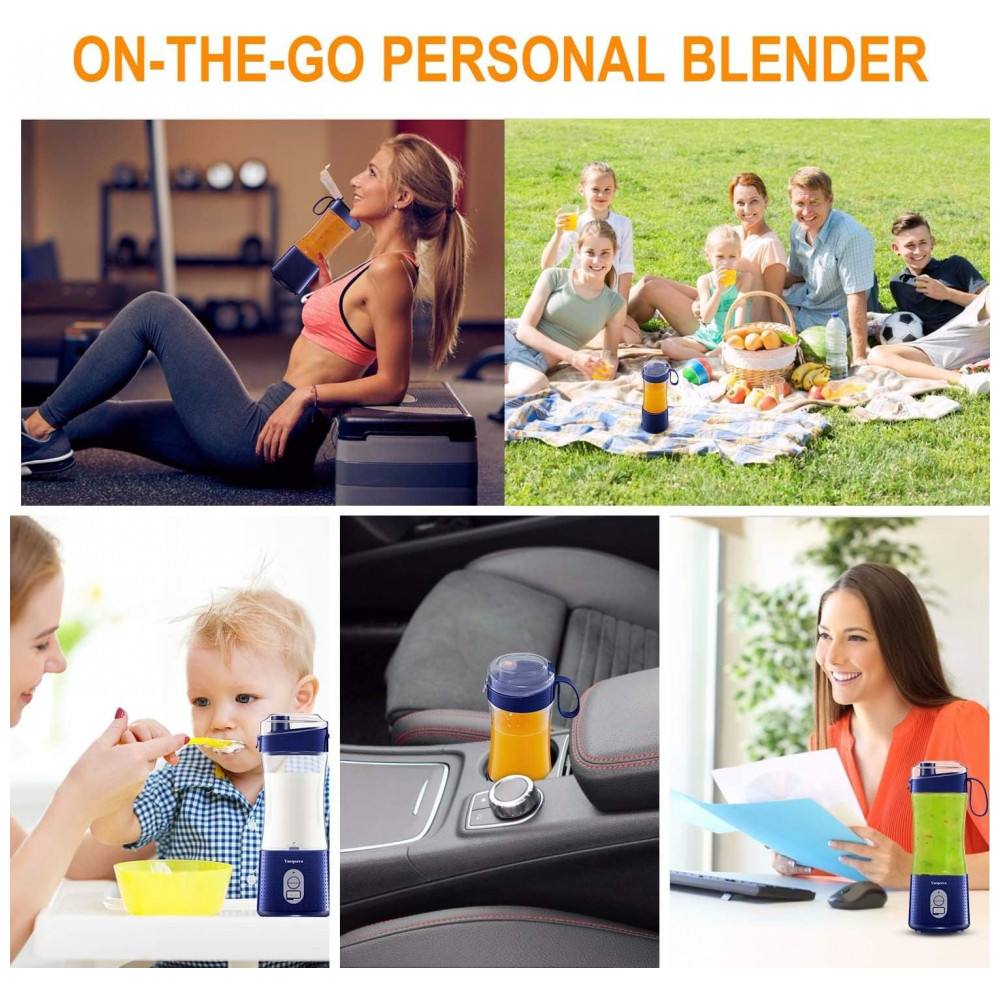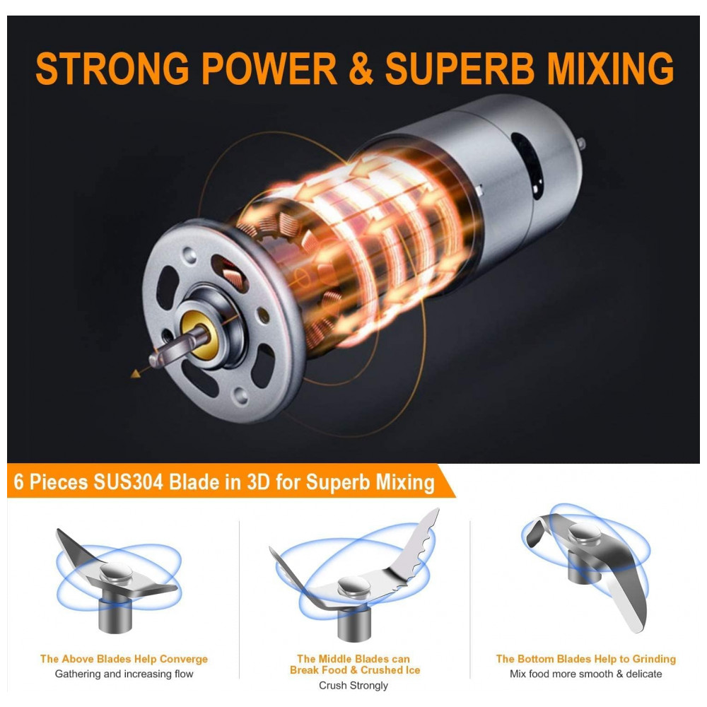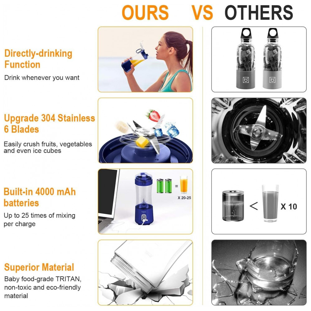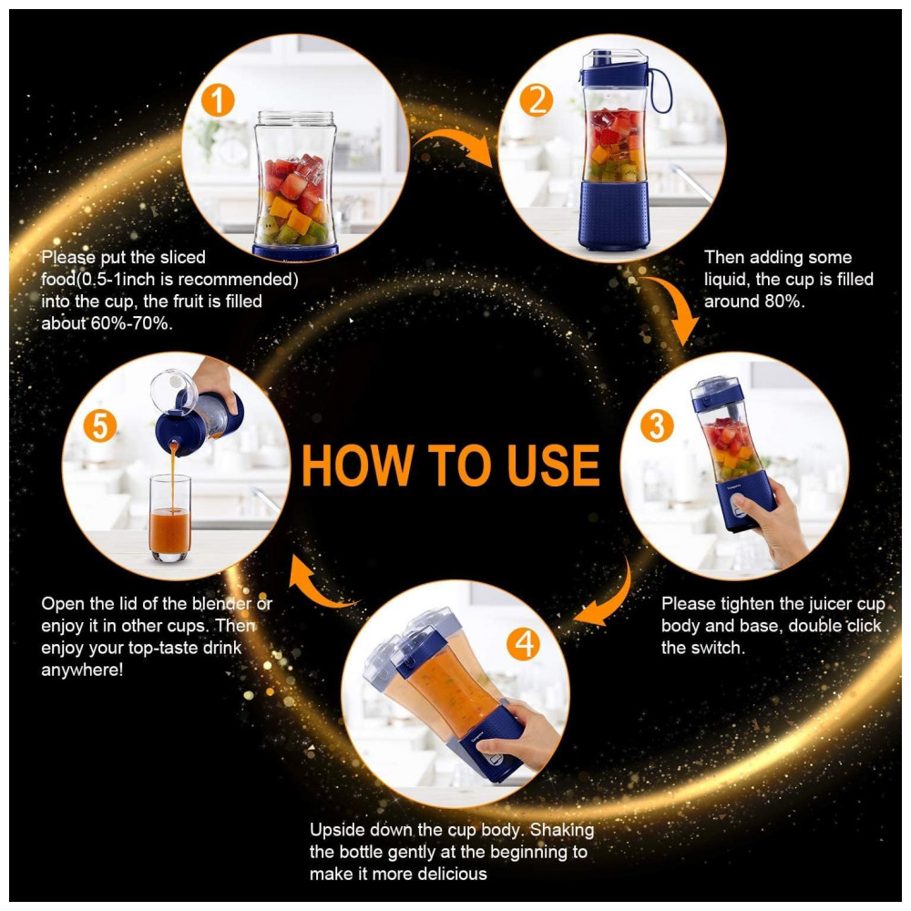 Lâminas atualizadas e velocidades mais altas e mais capacidade da bateria Lâminas SUS304 integradas de 6 peças em 3D e velocidade de rotação de até 22000 rpm, min.. O liquidificador portátil pode facilmente liquidificar qualquer coisa, incluindo pequenos cubos de gelo em pouco tempo. Construído em bateria de íon de lítio recarregável de 4000mAh 2 2000mAh, 20 25 xícaras de suco podem ser espremidas com carga total. Perfeito para shakes e smoothies, suco, shaker de proteína, molhos para salada etc.