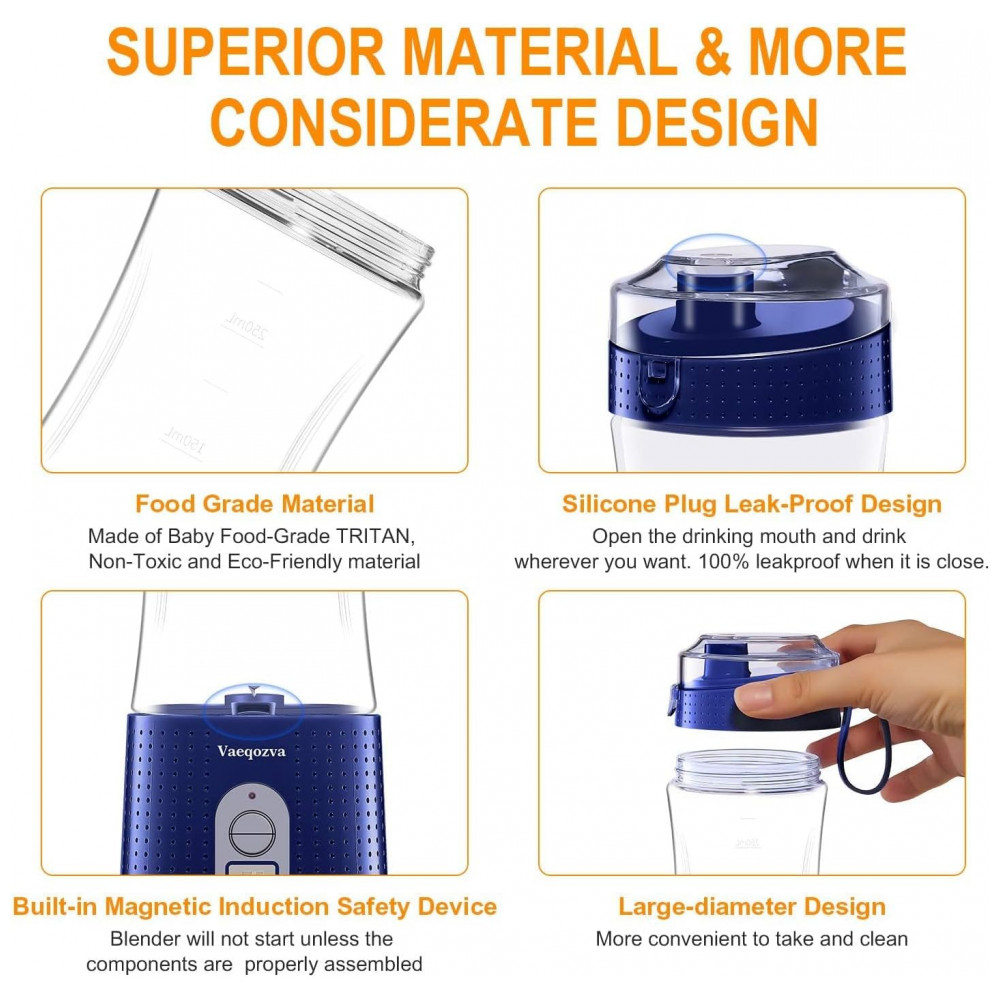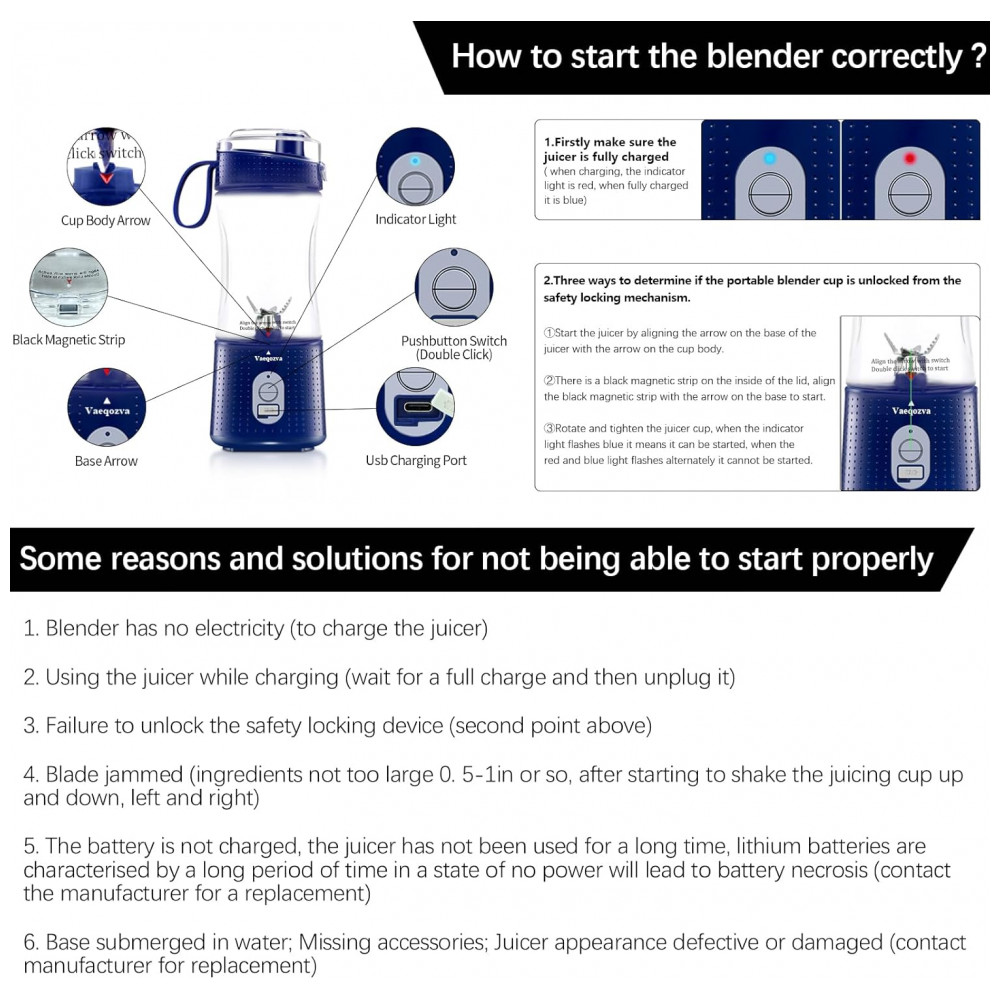 Material e proteção de segurança múltipla O corpo do liquidificador é feito do mesmo material Tritan que a mamadeira. Nossos produtos não apenas Dispositivo de segurança mecânico embutido que se os componentes não forem montados corretamente. Mas também proteção 100 sobrecarregada e superaquecida para baterias, prolongando a vida útil das mesmas. Garantir totalmente a segurança dos usuários. Dicas Por favor, não use o liquidificador ao carregar ou executar sem nada.