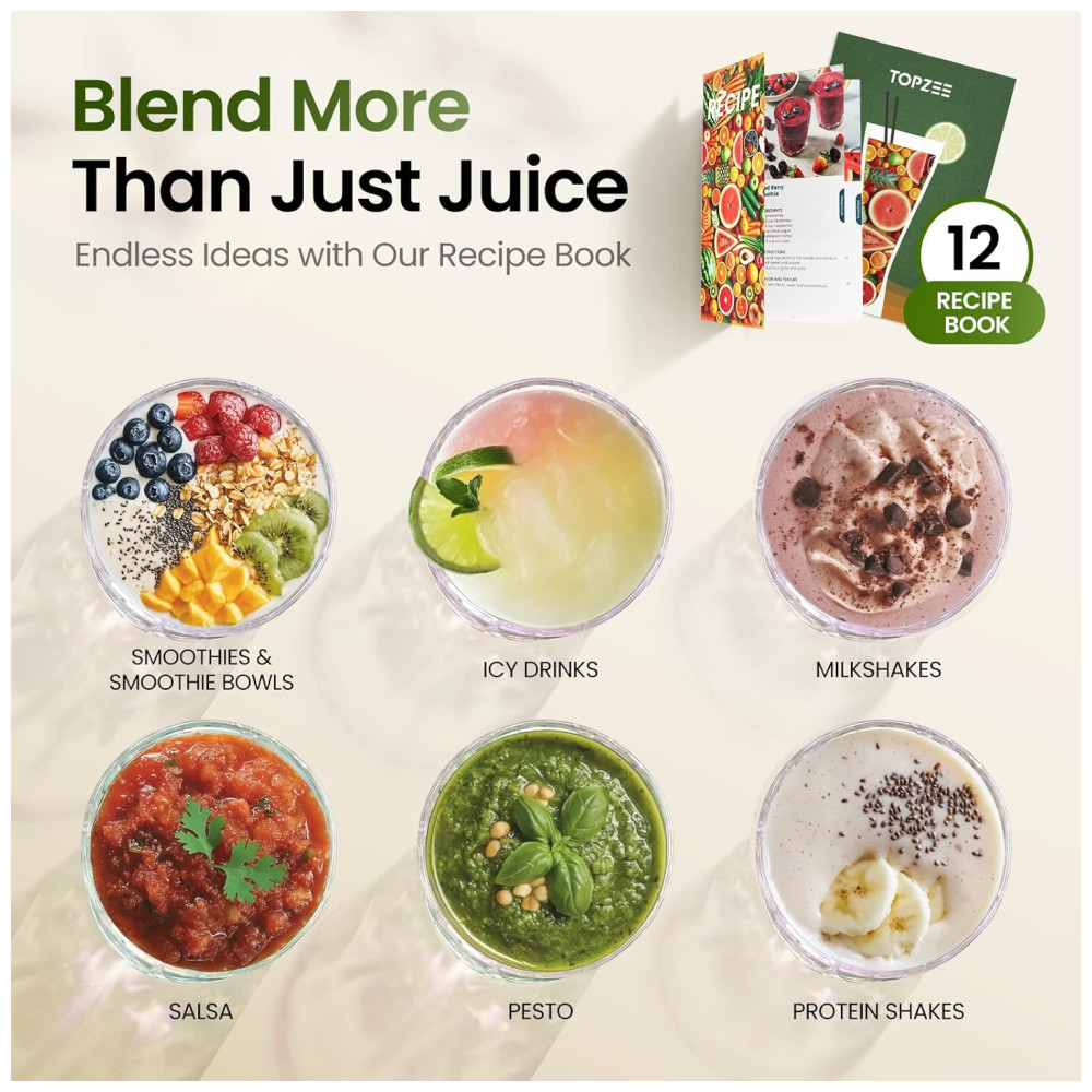 O triturador de gelo TOPZEE é um liquidificador potente de 1000W, com um motor de 1200W de pico, ideal para preparar smoothies saudáveis, bebidas geladas personalizadas e muito mais. Seu copo portátil de 0,85 litros permite fazer sucos frescos, milkshakes e outras bebidas nutritivas, contribuindo para uma alimentação equilibrada.