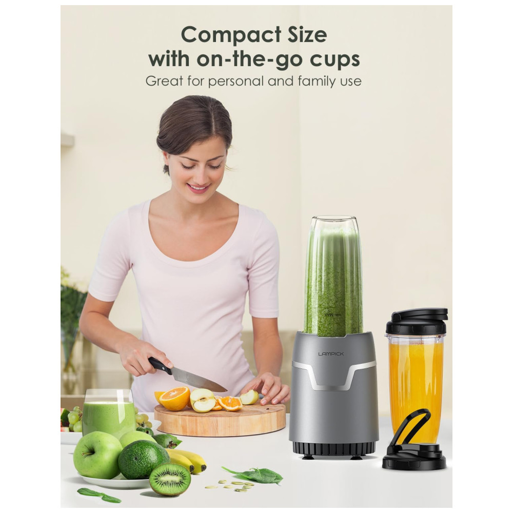 O liquidificador pessoal LAMPICK oferece 1100W de potência, motor de alta rotação (27.000 rpm) e sistema “push to blend” para preparo rápido de smoothies, shakes, sucos, papinhas, triturados de grãos e gelo. Acompanha conjunto de lâminas em aço inoxidável: uma de 6 pontas para misturas densas e gelo, outra lisa para moagem de grãos e oleaginosas. Possui dois copos de 650 ml e um pequeno de 300 ml, todos em plástico livre de BPA e compatíveis com lava-louças.