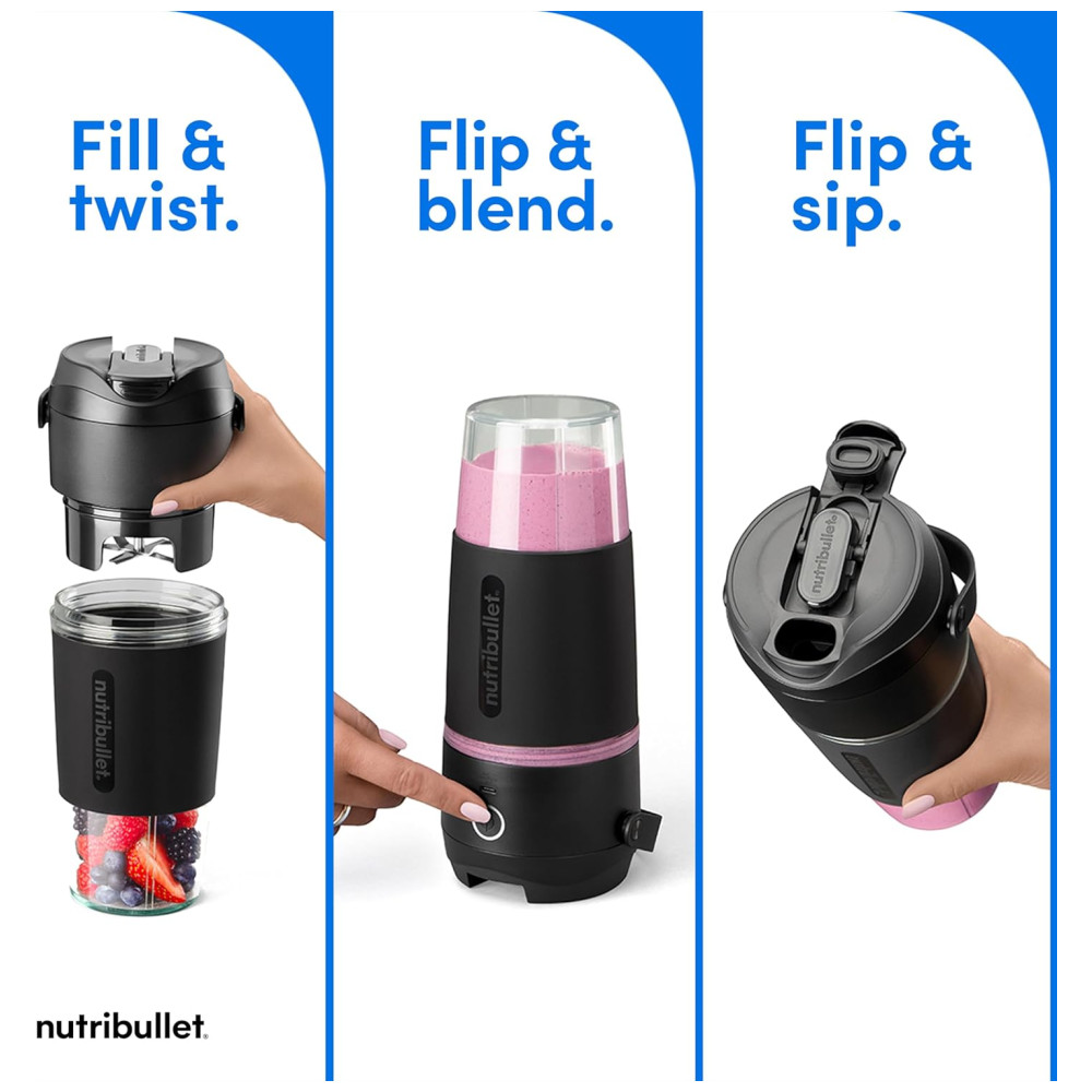 O Nutribullet Flip é um liquidificador portátil e copo de viagem, ideal para preparar suas misturas onde quer que você vá. Compacto e com alça de transporte, o Flip é perfeito para aventuras, viagens ou para o dia a dia. Seu copo de plástico Tritan durável e a capa de silicone foram desenvolvidos para suportar todas as suas misturas com praticidade e resistência.