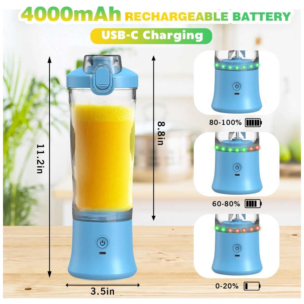 A alimentação é feita por bateria interna recarregável com tensão de 7,4V, utilizando cabo USB-C, e o sistema de trava de segurança impede o funcionamento se o copo não estiver corretamente encaixado na base. O conjunto é indicado para uso em cozinha, escritório, academia e viagens, em preparos líquidos frios ou em temperatura ambiente, conforme as orientações do fabricante.