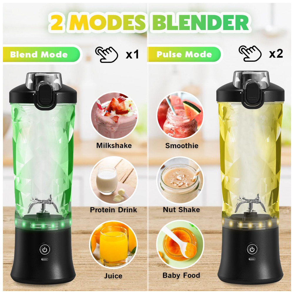 O aparelho oferece dois modos de uso: modo Blend, acionado com um toque, indicado para frutas macias e bebidas mais leves, e modo Pulse, ativado por duplo clique, voltado a gelo, frutas congeladas, castanhas e ingredientes mais densos. A capa térmica auxilia na manutenção da temperatura da bebida por mais tempo e protege o copo contra pequenos impactos e riscos durante o transporte.