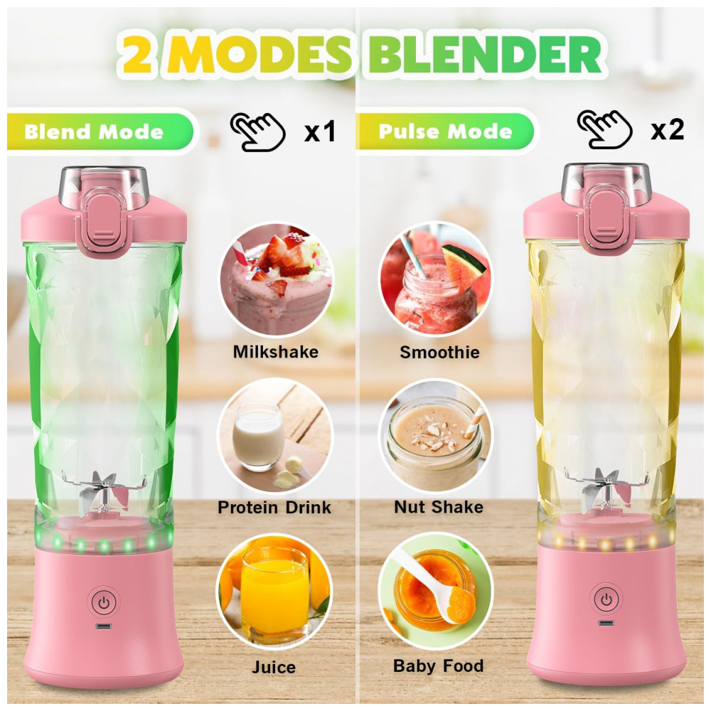 O liquidificador portátil NexaEase rosa com capa térmica bege foi projetado para preparo de shakes, smoothies e bebidas individuais, unindo copo de 600 ml em plástico livre de BPA a uma base motorizada recarregável via USB-C. O motor de 150W aciona 6 lâminas de aço inox a cerca de 18.000 rpm, permitindo triturar frutas, pequenos cubos de gelo, frutas congeladas, vegetais e misturas proteicas em ciclos de aproximadamente 30 segundos.