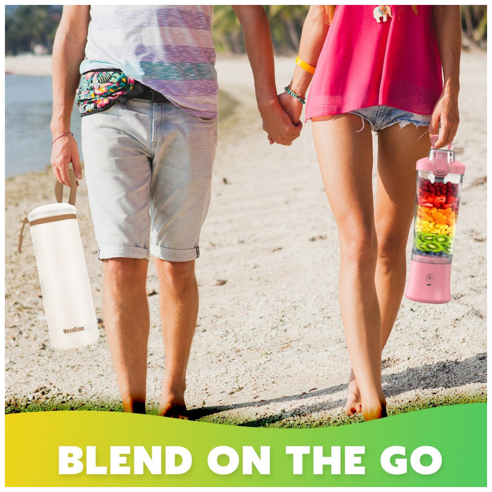 Liquidificador portátil NexaEase 600ml rosa com capa térmica bege recarregável USB-C para shakes e smoothies