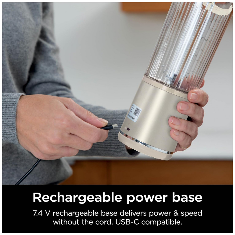 A base incorpora bateria interna recarregável via porta USB-C, proporcionando vários ciclos de uso por carga em função do tipo de preparo. A operação é feita por comandos simples no corpo do aparelho, com acionamento da mistura apenas quando a tampa está corretamente instalada, contribuindo para maior segurança.