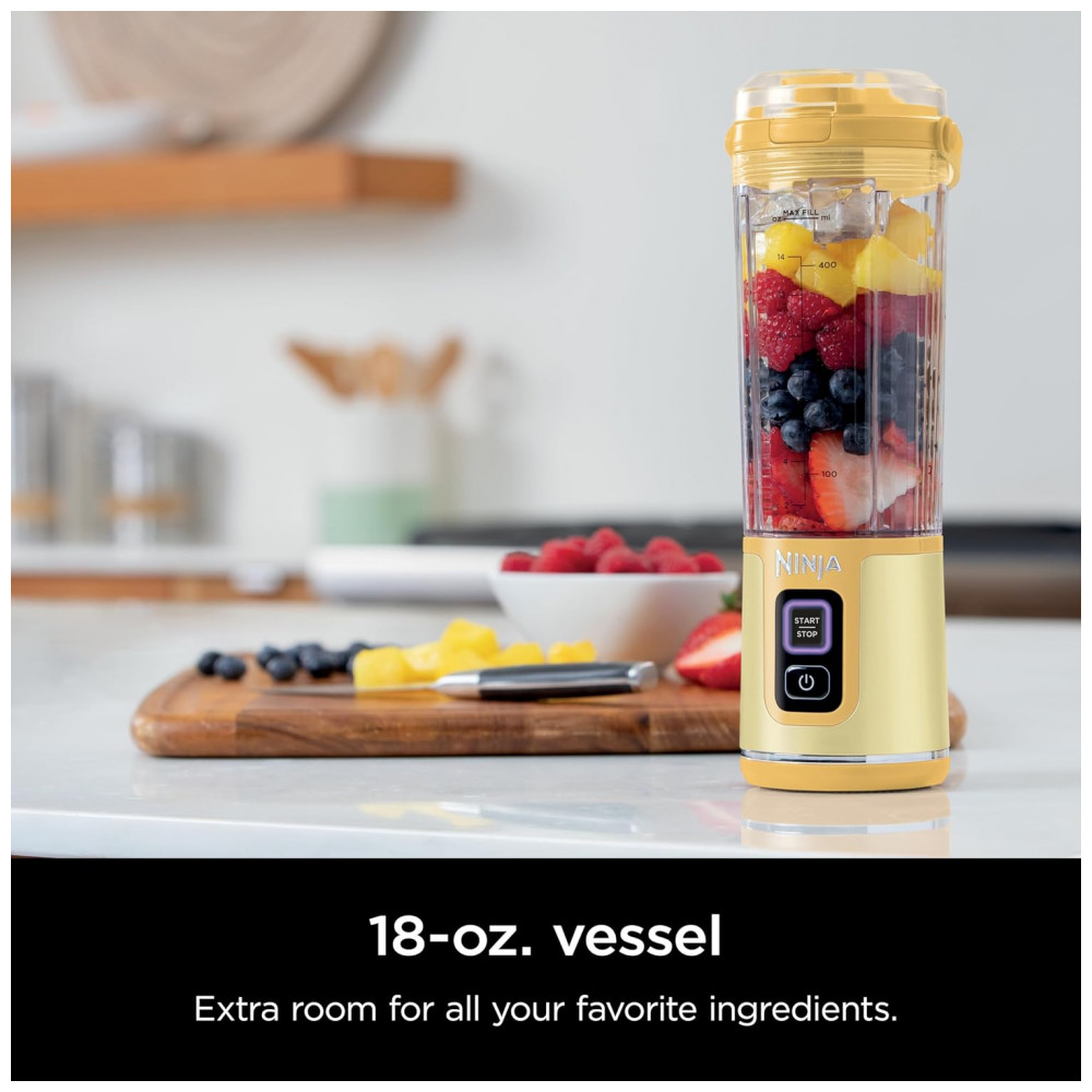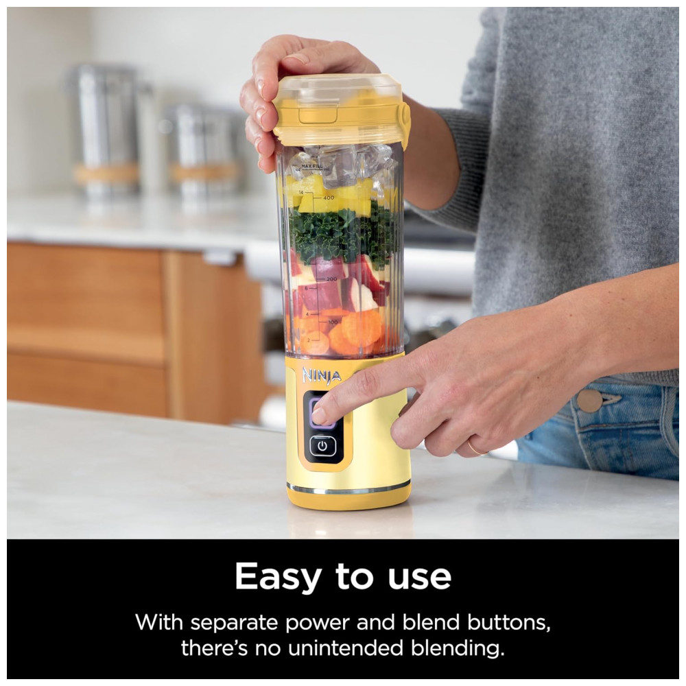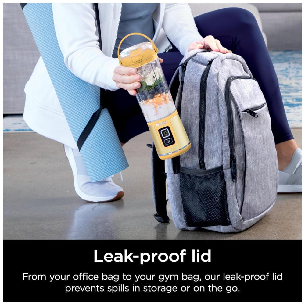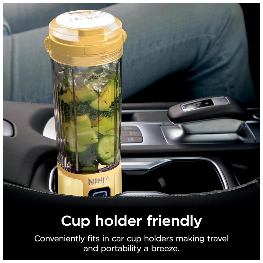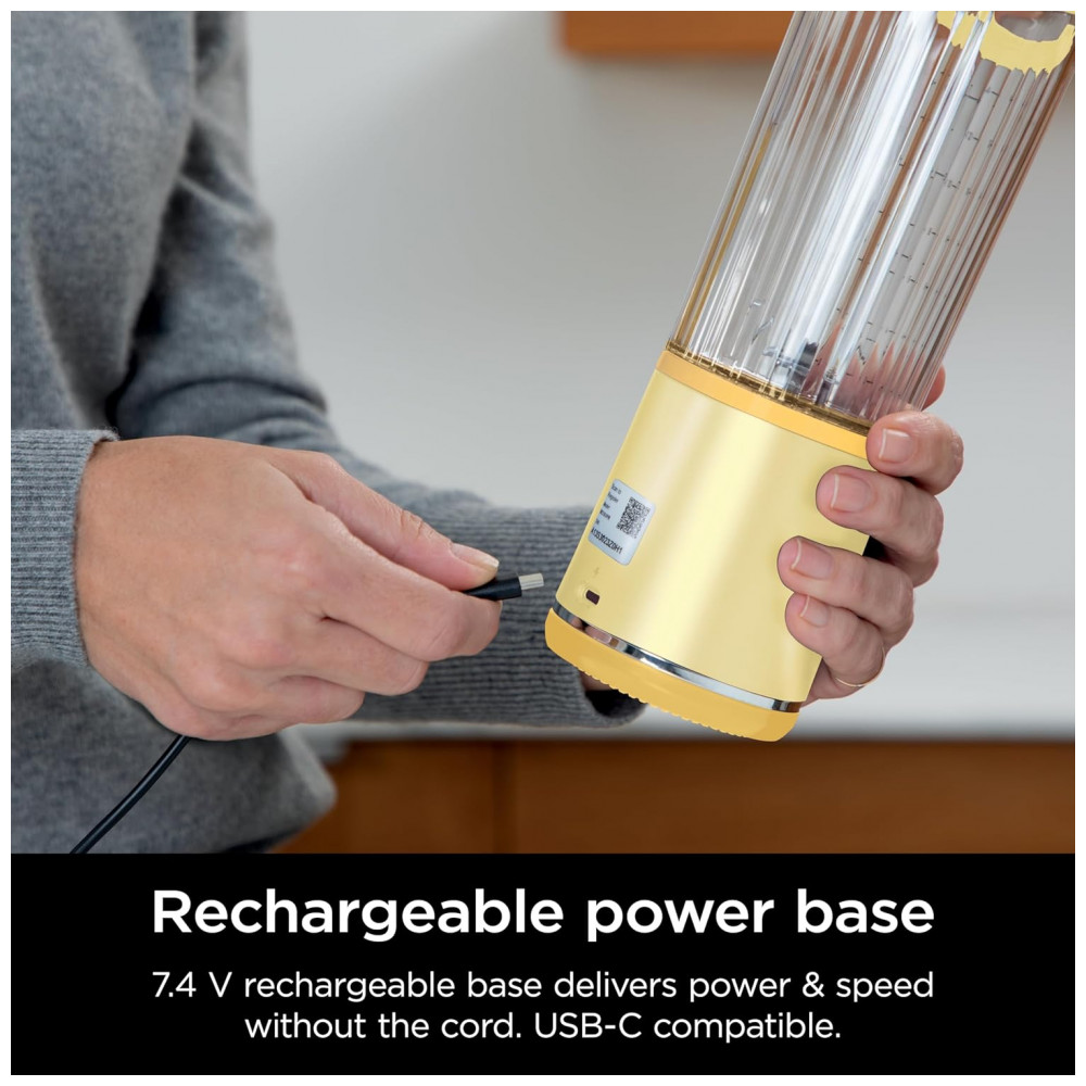 Liquidificador Portátil Ninja Blast Sem Fio Recipiente 530ml Tampa Antivazamento com Bico Amarelo BC151LB 7.4V (112 caracteres)