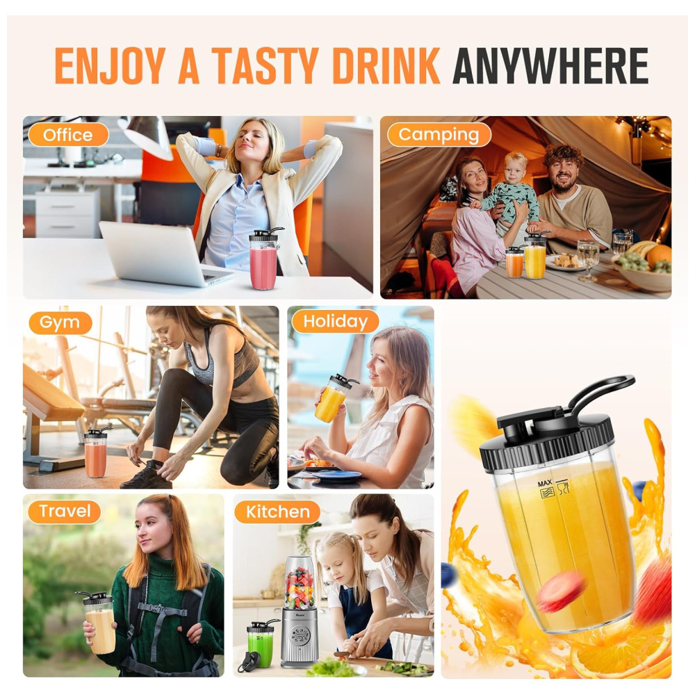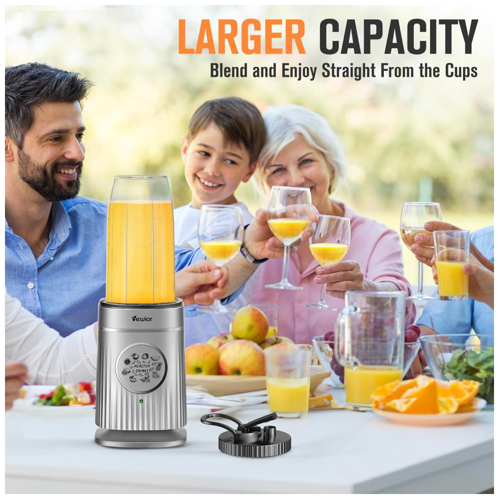 Com uma capacidade extra grande, este liquidificador pessoal pode fazer até 950ml de bebida de uma vez, atendendo confortavelmente várias pessoas, ideal para famílias ou grupos de amigos. A máquina de smoothies é acompanhada por um anel de silicone anti-vazamento e é portátil, permitindo que você a leve para onde precisar. Vem com duas copos perfeitos para diferentes quantidades de bebida.