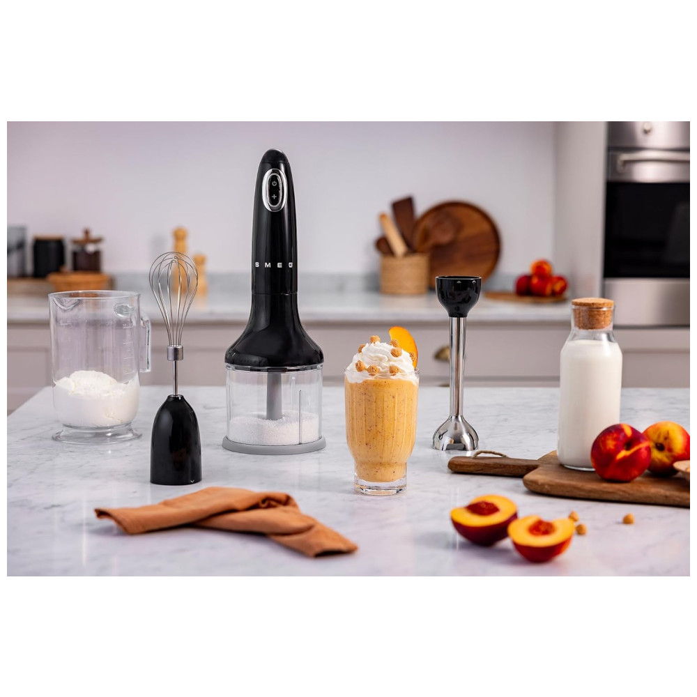 Desfrute de misturas, purês e misturas sem esforço com o liquidificador de imersão portátil da SMEG, uma perfeita fusão entre estilo retrô e recursos contemporâneos. Equipado com um potente motor de 350W, este liquidificador oferece cinco velocidades variáveis e uma função turbo, permitindo um controle preciso ao preparar milkshakes espessos, maionese cremosa, guacamole chunky ou sopas ultrassuaves. A SMEG, marca italiana renomada por seus eletrodomésticos inspirados no retrô e projetados em colaboração com os melhores arquitetos, criou essa ferramenta de cozinha versátil para elevar suas criações culinárias. O conjunto inclui liquidificador de imersão, copo medidor perfeito para molhos, tigela de picar com tampa para um processamento eficiente, batedor de arame para bater rapidamente ovos, claras e creme. Com cinco velocidades variáveis e botão turbo, você terá controle preciso para todas as suas necessidades de mistura. As lâminas duráveis de aço inoxidável, impulsionadas por um robusto motor de 350W, misturam, misturam e trituram ingredientes em segundos. O design ergonômico com cabo antiderrapante garante uma pegada confortável e firme durante o uso. A montagem e a limpeza são fáceis, o botão de travamento prende firmemente o eixo de aço inoxidável ao cabo, que pode ser removido facilmente para limpeza e armazenamento. Com um anel de botão em cromo polido, o liquidificador é tão elegante quanto funcional.