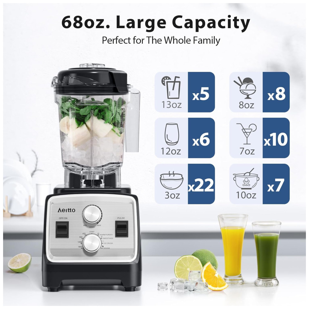 O Liquidificador Aeitto oferece um motor potente de 1800W e incríveis 25.000 RPM para processar rapidamente ingredientes e gelo, criando deliciosas bebidas, smoothies e moendo diversos tipos de pós. Com capacidade extra grande de 2,01 litros, é perfeito para famílias grandes ou jantares para várias pessoas, reduzindo a necessidade de múltiplas operações. Além disso, possui um copo de moagem de 828ml para café, nozes, especiarias e muito mais. Com a função 2 em 1 de liquidificar e moer, você terá um único aparelho para diversas necessidades, economizando dinheiro.Operação simples e intuitiva para tornar o preparo de alimentos mais fácil e divertido.