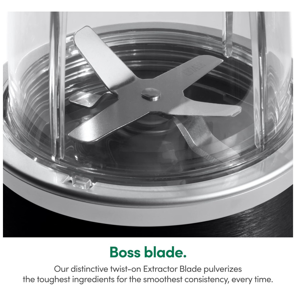 Itens inclusos: 1 base motora, 1 lâmina extratora, 2 copos grandes, 2 tampas to-go, 2 anéis de conforto, 2 anéis com alça, manual e livro de receitas