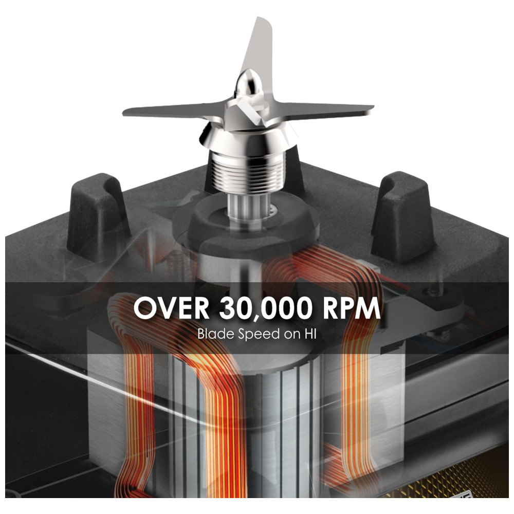 Os controles de interruptor, claramente marcados como HIGH, LOW, OFF e PULSE, permitem triturar gelo e frutas congeladas em segundos. O recipiente empilhável de 1,4 litros é feito de copoliéster livre de BPA, facilitando o armazenamento.