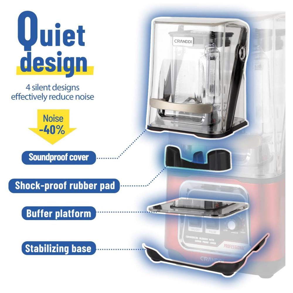 O liquidificador profissional CRANDDI K80 oferece motor industrial de alta potência com 2200W e 38.000 rotações por minuto, proporcionando resultados rápidos e homogêneos. Equipado com 6 lâminas de aço inoxidável para triturar gelo, preparar milkshakes, smoothies, sucos, cremes e purês em apenas 5 segundos. Sua jarra tem capacidade de 1,5 litro (52 oz) feita de plástico alimentício resistente de 6 mm, praticamente inquebrável.