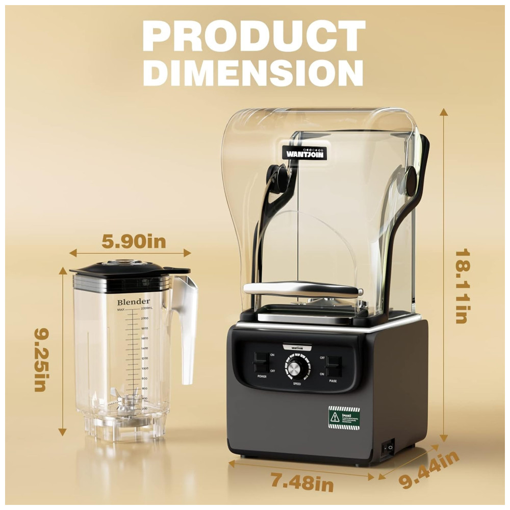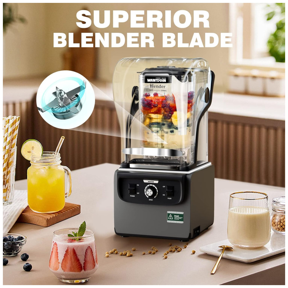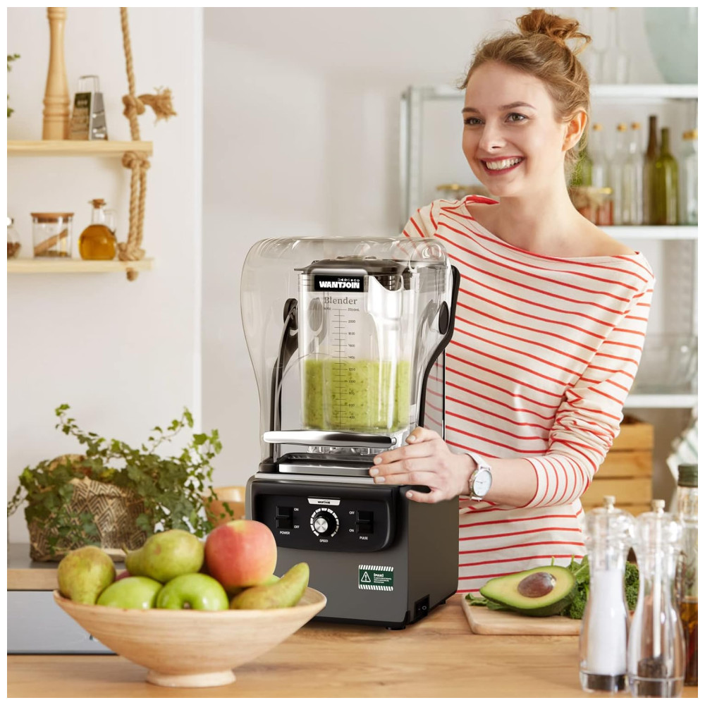 Este liquidificador de bancada para cozinha possui 1.800 watts de potência máxima, além de lâminas afiadas de aço inoxidável de alta velocidade, capazes de triturar cubos de gelo em apenas 5 segundos. Com uma capacidade de 2.2L e escala transparente, este liquidificador é ideal para uso em restaurantes comerciais ou em cozinhas domésticas, permitindo o preparo de mais smoothies e shakes de uma só vez.