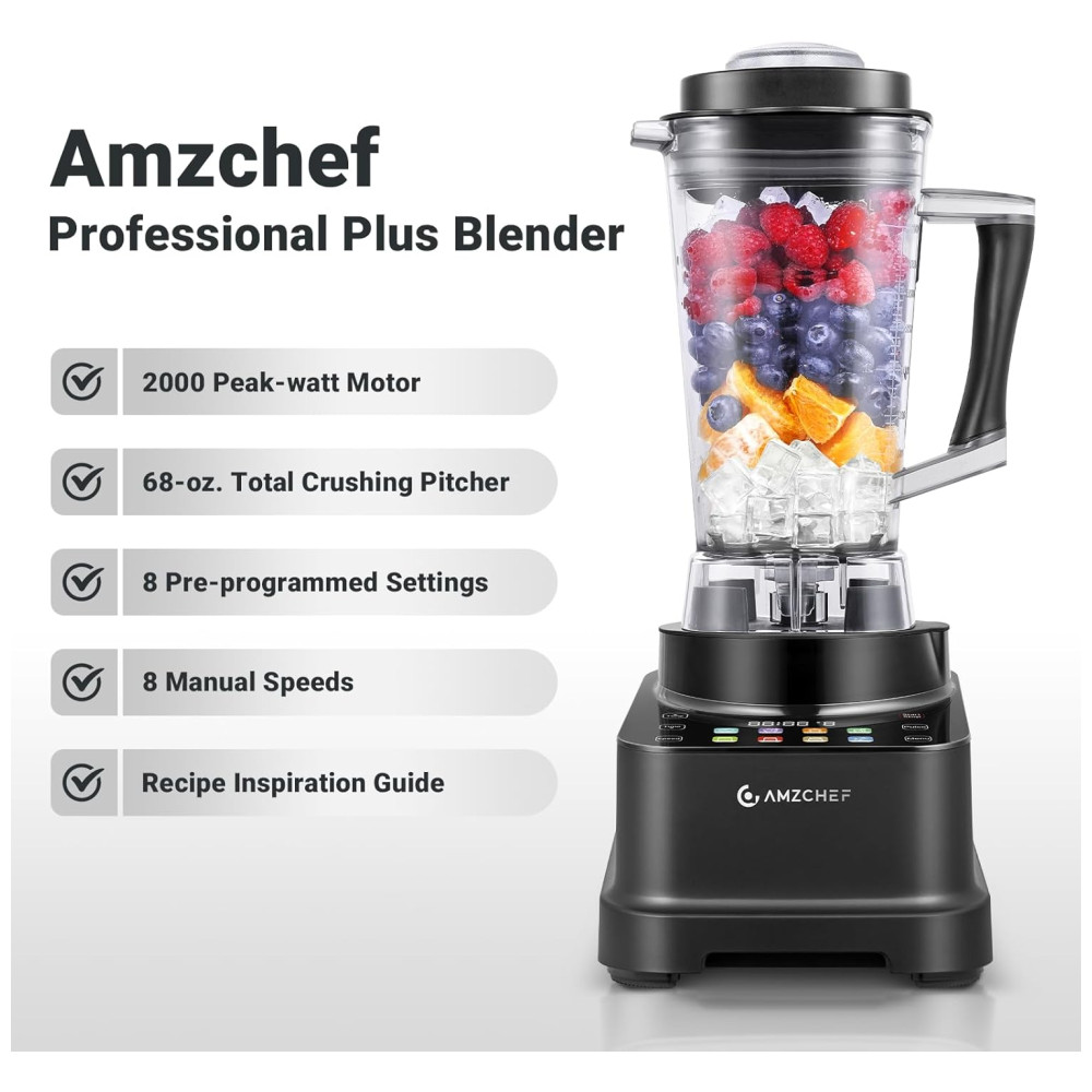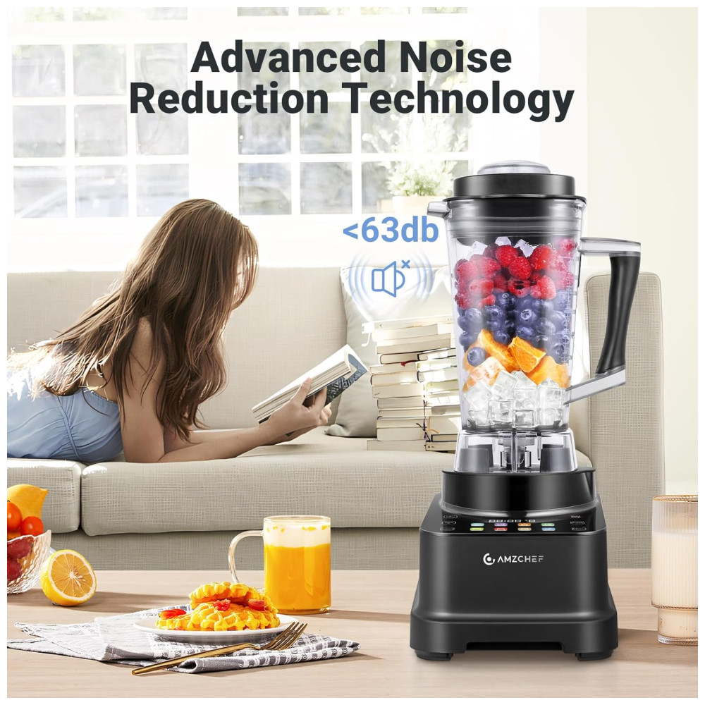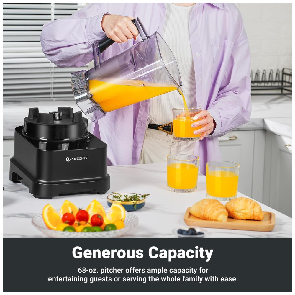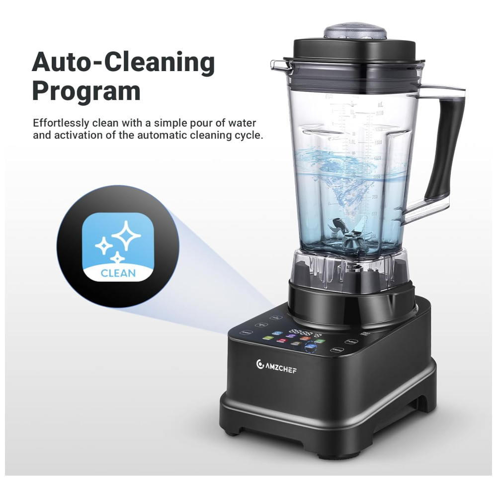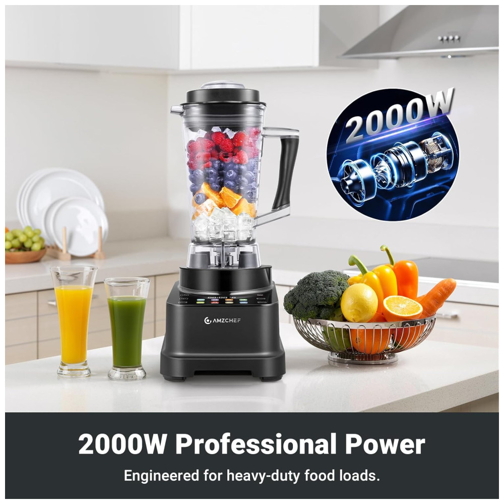 Base do Motor de 2000 Watts de Pico: O liquidificador de bancada profissional da Amzchef, equipado com lâminas duráveis de aço inoxidável, é projetado para lidar facilmente até com os ingredientes mais difíceis.