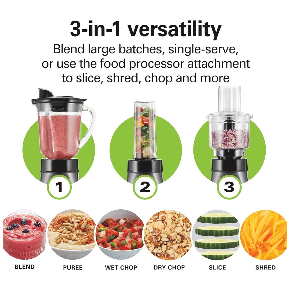 Descubra o Liquidificador e Processador de Alimentos 3 em 1 da Hamilton Beach, com Jarra de Vidro de 1182,94 ml, Copo de Viagem Portátil de 591,47 ml para Misturar e Anexar Picador de Alimentos Elétrico de 3 Copos, 700 Watts, em Cinza e Preto (58163).