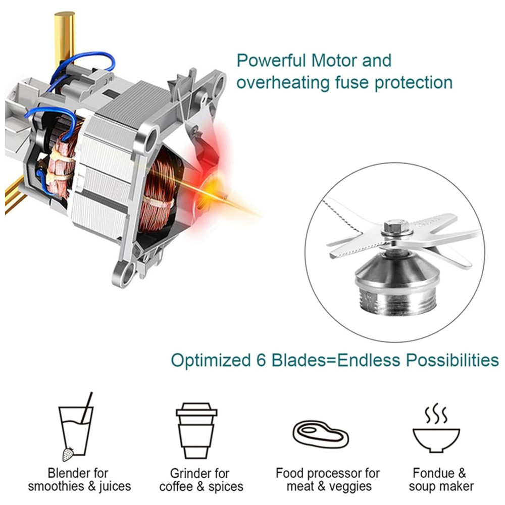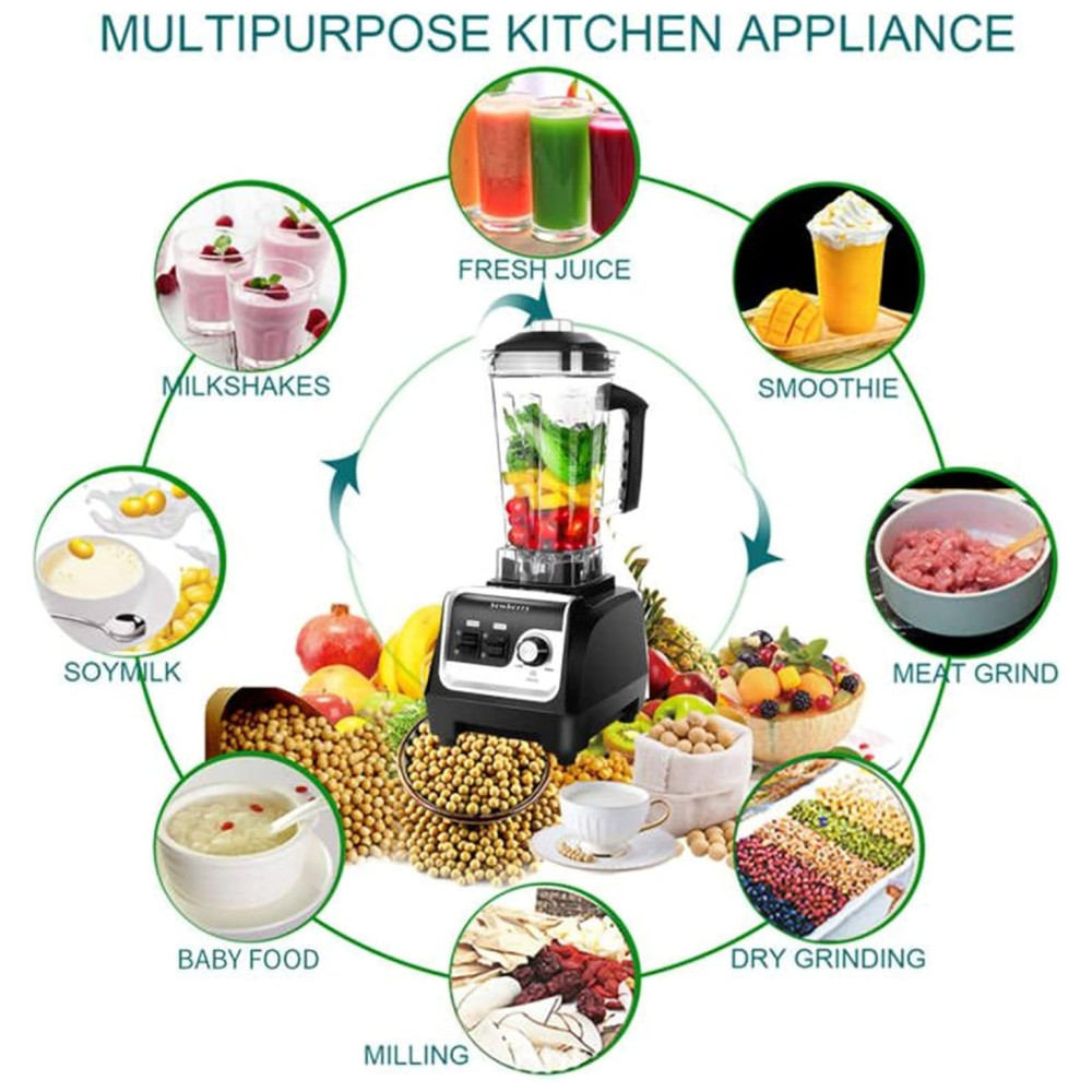 Apresentamos o Liquidificador Profissional de Alta Performance, equipado com um motor potente de 2200 watts e 40000 RPM, além de 6 lâminas de aço inoxidável endurecido. Este liquidificador de alta velocidade pode facilmente triturar cubos de gelo e frutas congeladas, transformando grandes cubos de gelo em uma mistura cremosa em segundos.