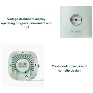 O liquidificador retrô ECretro é um modelo pessoal de bancada projetado para preparo de smoothies, shakes e bebidas geladas em porções individuais, com design vintage em acabamento verde. A potência de 300W, aliada ao motor que atinge rotações elevadas, permite triturar frutas, legumes macios e gelo em cubos pequenos, atendendo rotinas em casa, no escritório ou na academia.