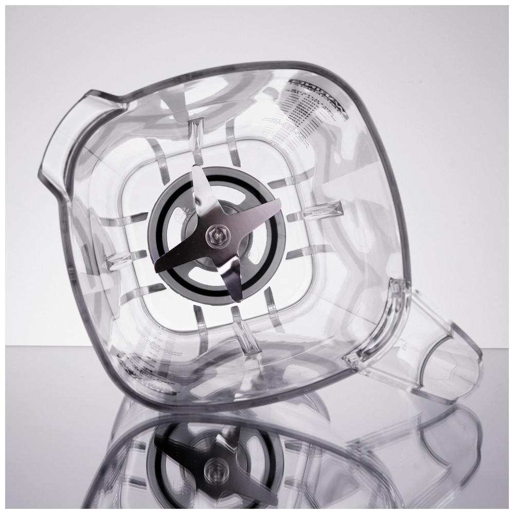 Possui recipiente inquebrável de copoliéster livre de BPA, com capacidade de 1,9 L, compatível com lava-louças e empilhável para otimização do espaço. Sistema exclusivo de lâminas Raptor de aço inoxidável, proporcionando trituração agressiva e resultados mais rápidos e uniformes.