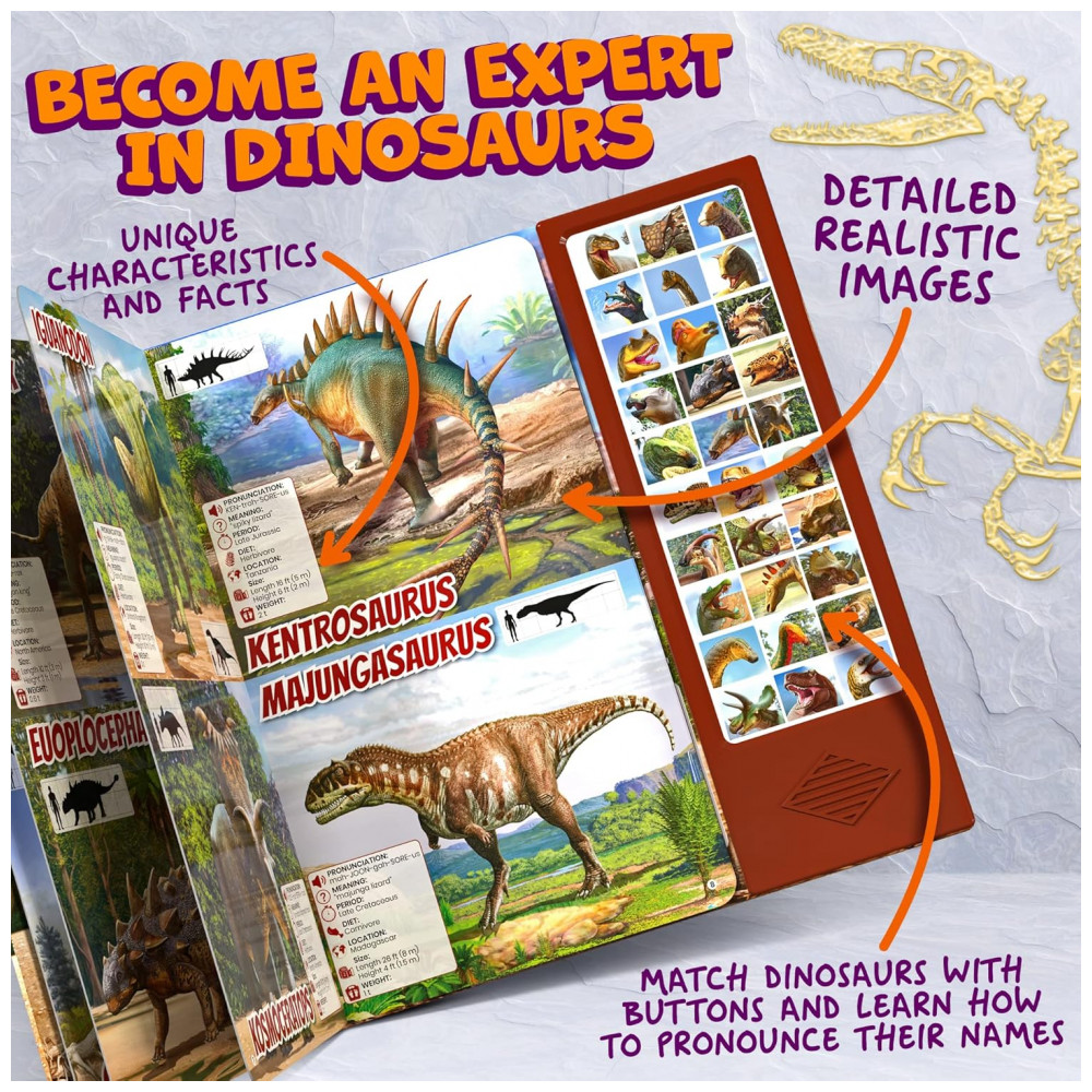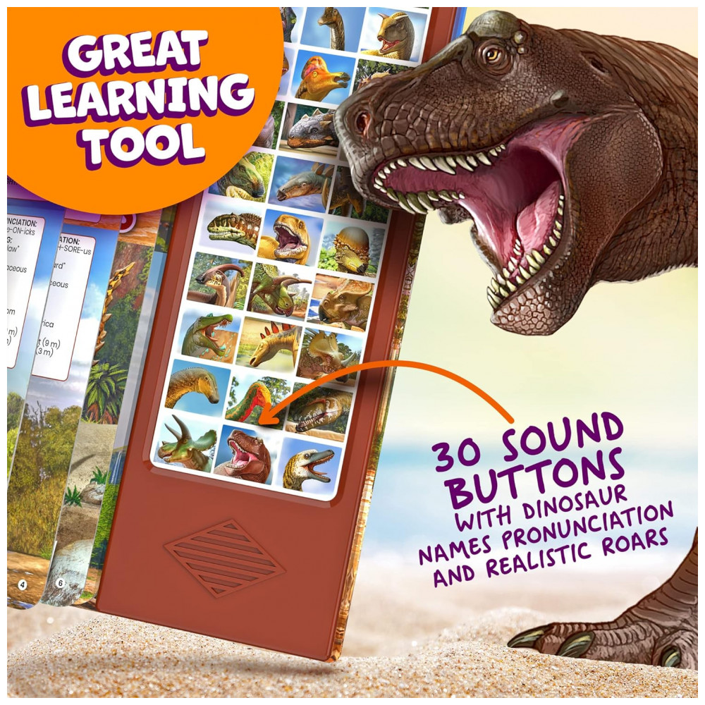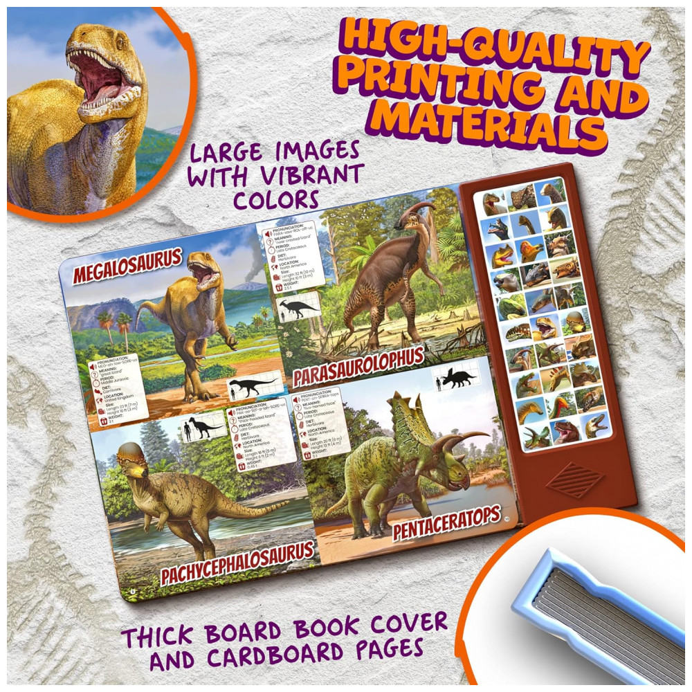 Este incrível livro de sons de dinossauros é uma ferramenta educativa fantástica que permite às crianças associar 30 espécies de dinossauros a botões sonoros que, ao serem pressionados, emitem rugidos realistas, ajudando os pequenos a aprender a pronúncia dos nomes dos dinossauros. Cada dinossauro é apresentado com informações detalhadas sobre pronúncia, significado, dieta, localização, tamanho e é comparado ao lado de um humano. Com impressão de alta qualidade e materiais resistentes, este livro de dinossauros traz imagens realistas em cores vibrantes de paleoartistas líderes mundiais. A capa do livro é feita de material resistente e as páginas de papelão evitam que ele dobre. Com um tamanho de 28×25 centímetros, é maior do que qualquer outro livro de sons de dinossauros disponível no mercado. O presente perfeito para os amantes de dinossauros, seja no Natal, aniversário ou festa temática de dinossauros. Deixe seu filho se tornar um especialista em dinossauros com este livro interativo e educativo, garantindo horas de diversão e aprendizado.